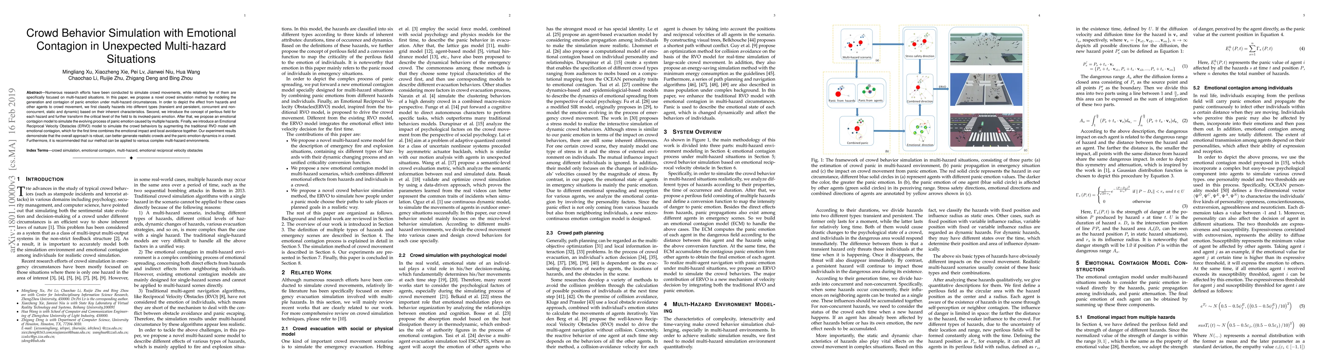 This paper introduces a crowd simulation method that models the generation and contagion of panic emotion under various multi-hazard scenarios, employing an Emotional Reciprocal Velocity Obstacles (ERVO) model to integrate emotional contagion with traditional local avoidance, resulting in realistic crowd behavior simulations in unexpected multi-hazard situations.