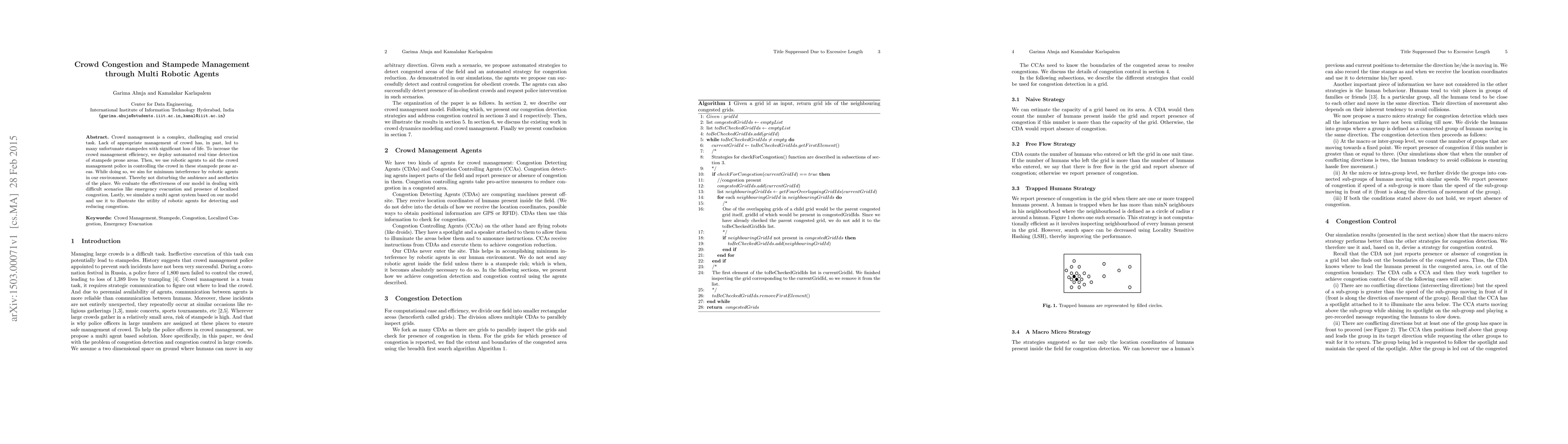 This paper proposes a system using multi-robotic agents to manage crowd congestion and prevent stampedes by detecting high-risk areas and aiding police with minimal interference. The effectiveness of the model is evaluated in emergency evacuation and localized congestion scenarios through simulations.