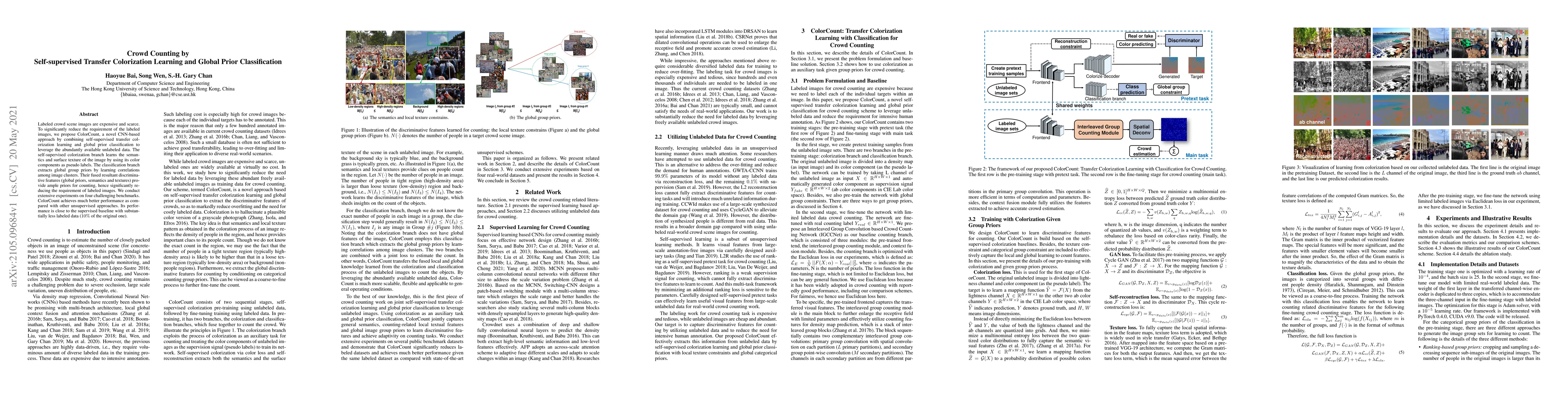 Labeled crowd scene images are expensive and scarce. To significantly reduce the requirement of the labeled images, we propose ColorCount, a novel CNN-based approach by combining self-supervised transfer colorization learning and global prior classification to leverage the abundantly available unlabeled data. The self-supervised colorization branch learns the semantics and surface texture of the image by using its color components as pseudo labels. The classification branch extracts global group priors by learning correlations among image clusters. Their fused resultant discriminative features (global priors, semantics and textures) provide ample priors for counting, hence significantly reducing the requirement of labeled images. We conduct extensive experiments on four challenging benchmarks. ColorCount achieves much better performance as compared with other unsupervised approaches. Its performance is close to the supervised baseline with substantially less labeled data (10\% of the original one).