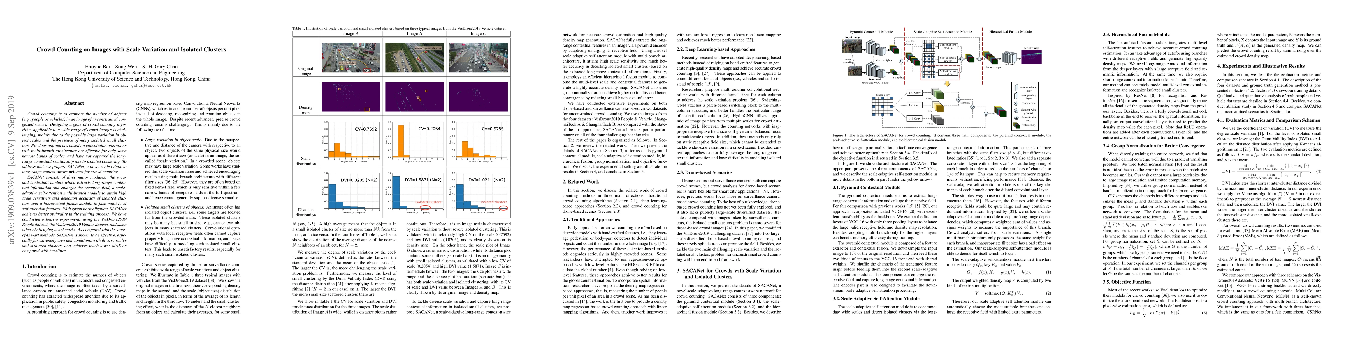 A new crowd counting algorithm called SACANet is proposed to accurately count objects in images with varying scales and isolated clusters. It outperforms state-of-the-art methods, especially in extremely crowded conditions.