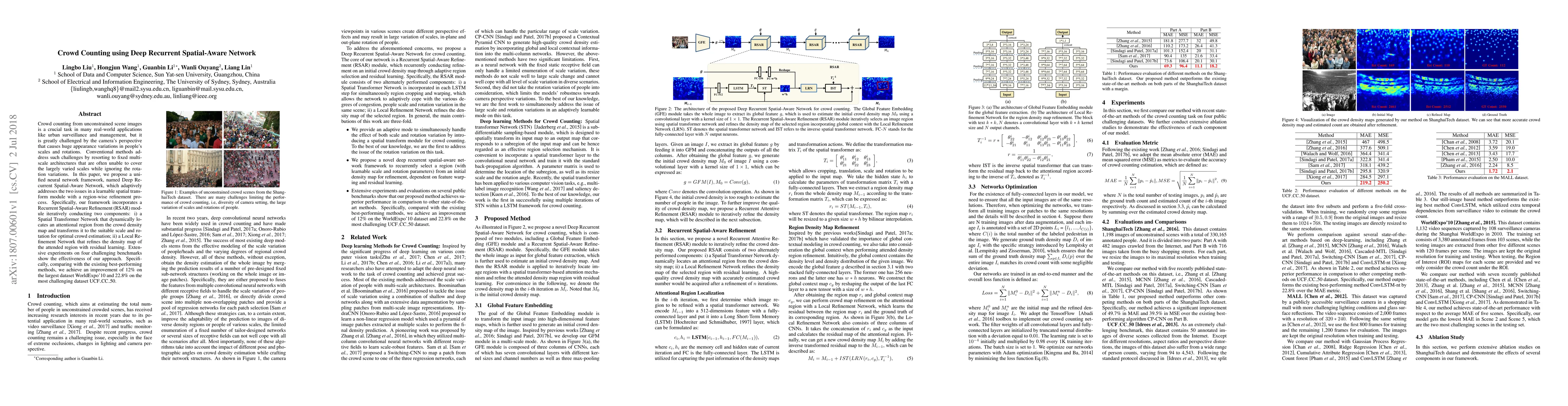 This paper proposes a Deep Recurrent Spatial-Aware Network to adaptively address scale and rotation variations in crowd counting, using a Spatial Transformer Network and Local Refinement Network for optimal crowd estimation. The approach achieves significant improvements over existing methods on multiple benchmarks.