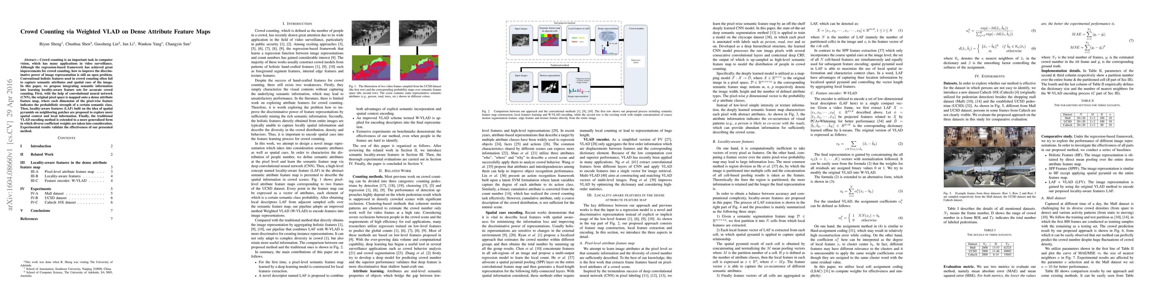 This paper proposes a crowd counting method that integrates semantic information into dense attribute feature maps derived from CNNs, combined with locality-aware features and weighted VLAD encoding to enhance discriminative power, achieving improved accuracy in crowd counting. Experimental results demonstrate the effectiveness of the proposed approach.