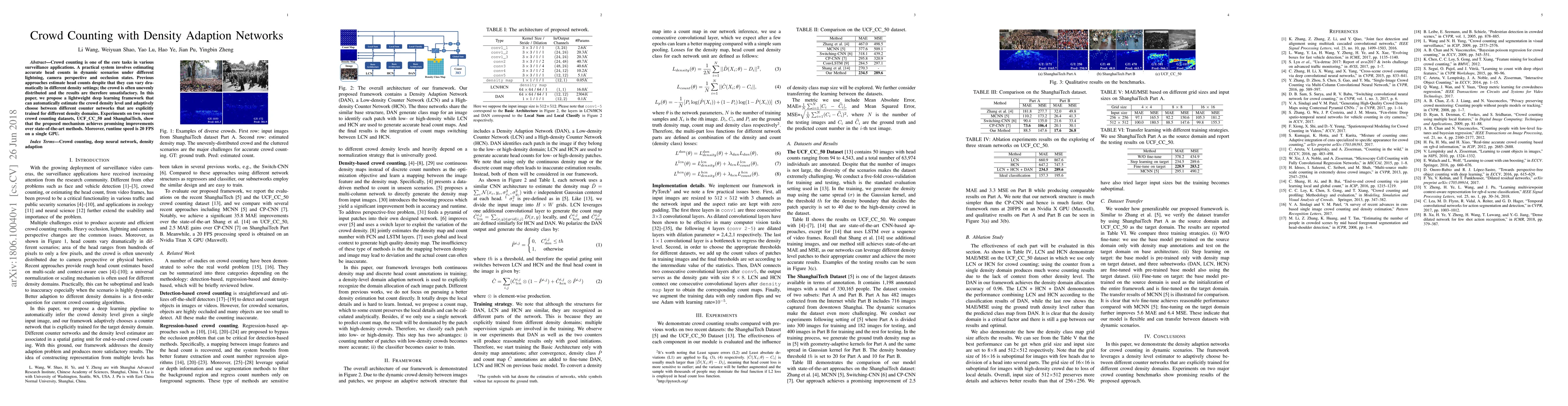 This paper proposes a lightweight deep learning framework for crowd counting that automatically adapts to different crowd density levels by selecting between specialized counter networks trained for various density domains, achieving better accuracy and a runtime speed of 20 FPS on a single GPU. Experiments demonstrate significant improvements over existing methods on UCF_CC_50 and ShanghaiTech datasets.