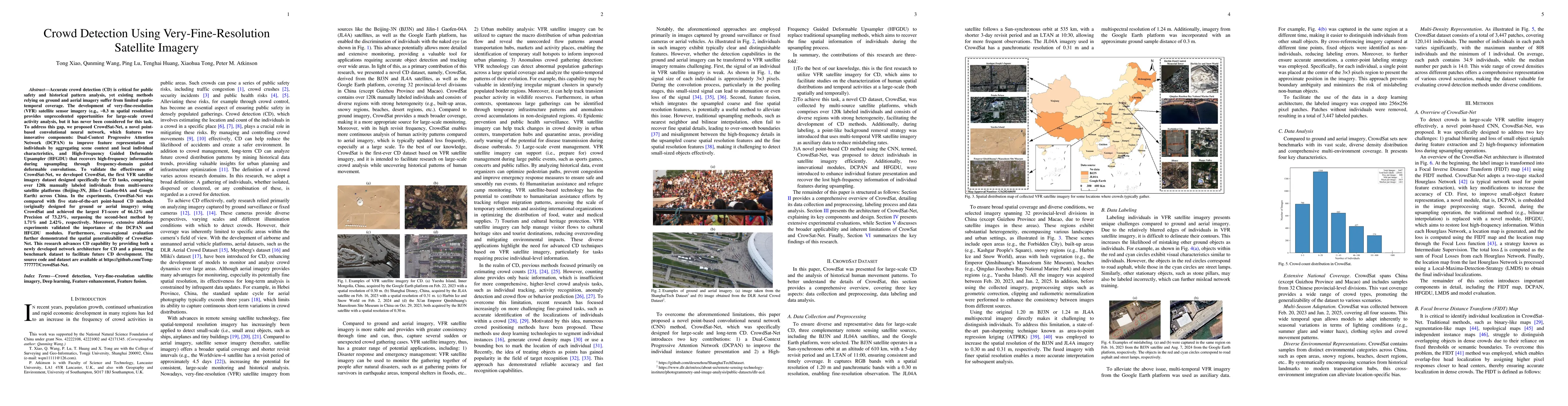 Accurate crowd detection (CD) is critical for public safety and historical pattern analysis, yet existing methods relying on ground and aerial imagery suffer from limited spatio-temporal coverage. The development of very-fine-resolution (VFR) satellite sensor imagery (e.g., ~0.3 m spatial resolution) provides unprecedented opportunities for large-scale crowd activity analysis, but it has never been considered for this task. To address this gap, we proposed CrowdSat-Net, a novel point-based convolutional neural network, which features two innovative components: Dual-Context Progressive Attention Network (DCPAN) to improve feature representation of individuals by aggregating scene context and local individual characteristics, and High-Frequency Guided Deformable Upsampler (HFGDU) that recovers high-frequency information during upsampling through frequency-domain guided deformable convolutions. To validate the effectiveness of CrowdSat-Net, we developed CrowdSat, the first VFR satellite imagery dataset designed specifically for CD tasks, comprising over 120k manually labeled individuals from multi-source satellite platforms (Beijing-3N, Jilin-1 Gaofen-04A and Google Earth) across China. In the experiments, CrowdSat-Net was compared with five state-of-the-art point-based CD methods (originally designed for ground or aerial imagery) using CrowdSat and achieved the largest F1-score of 66.12% and Precision of 73.23%, surpassing the second-best method by 1.71% and 2.42%, respectively. Moreover, extensive ablation experiments validated the importance of the DCPAN and HFGDU modules. Furthermore, cross-regional evaluation further demonstrated the spatial generalizability of CrowdSat-Net. This research advances CD capability by providing both a newly developed network architecture for CD and a pioneering benchmark dataset to facilitate future CD development.