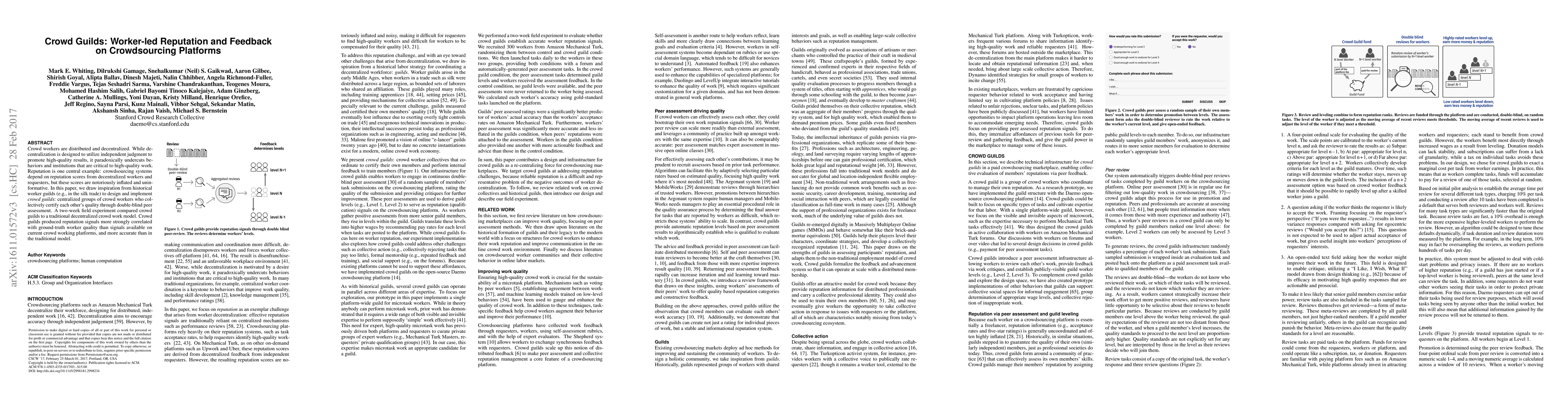 This paper proposes crowd guilds, centralized groups of workers who mutually assess each other's quality via double-blind peer review, inspired by historical worker guilds. A field experiment found that crowd guilds generated more accurate reputation signals correlated with actual worker quality compared to traditional decentralized crowd work models.