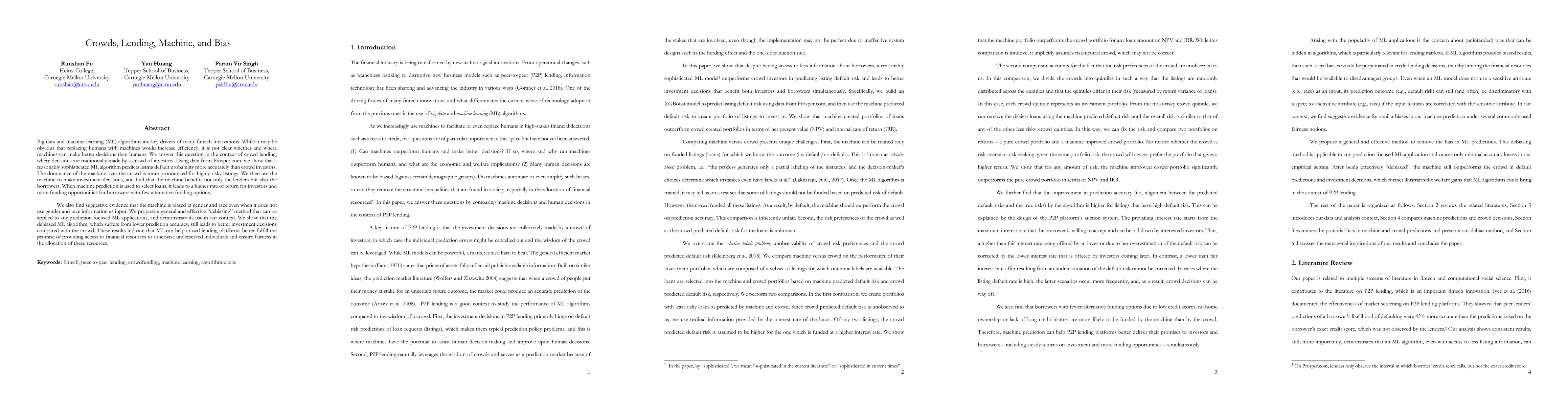 Big data and machine learning (ML) algorithms are key drivers of many fintech innovations. While it may be obvious that replacing humans with machine would increase efficiency, it is not clear whether and where machines can make better decisions than humans. We answer this question in the context of crowd lending, where decisions are traditionally made by a crowd of investors. Using data from Prosper.com, we show that a reasonably sophisticated ML algorithm predicts listing default probability more accurately than crowd investors. The dominance of the machine over the crowd is more pronounced for highly risky listings. We then use the machine to make investment decisions, and find that the machine benefits not only the lenders but also the borrowers. When machine prediction is used to select loans, it leads to a higher rate of return for investors and more funding opportunities for borrowers with few alternative funding options. We also find suggestive evidence that the machine is biased in gender and race even when it does not use gender and race information as input. We propose a general and effective "debasing" method that can be applied to any prediction focused ML applications, and demonstrate its use in our context. We show that the debiased ML algorithm, which suffers from lower prediction accuracy, still leads to better investment decisions compared with the crowd. These results indicate that ML can help crowd lending platforms better fulfill the promise of providing access to financial resources to otherwise underserved individuals and ensure fairness in the allocation of these resources.