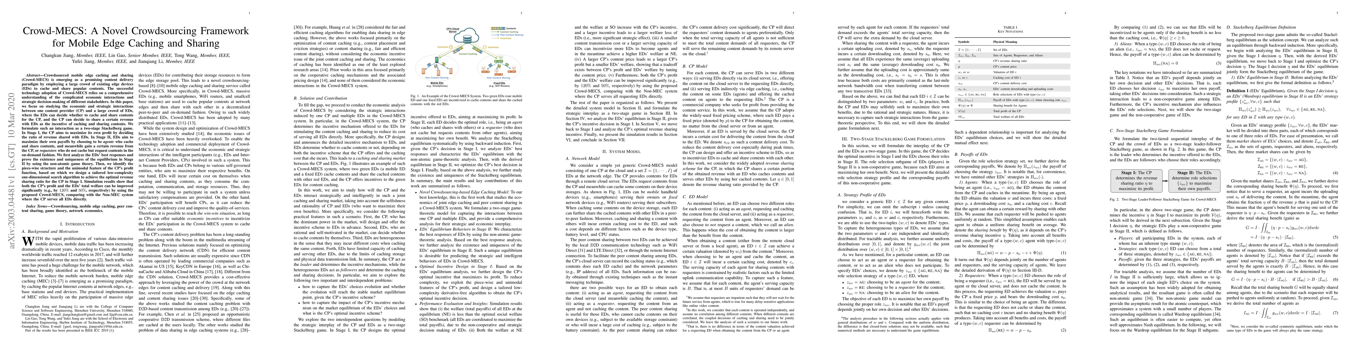 This paper proposes Crowd-MECS, a crowdsourcing framework for mobile edge caching and sharing, employing a large crowd of edge devices to cache and share popular contents. It formulates the economic interactions between a content provider and edge devices as a two-stage Stackelberg game, optimizing the revenue sharing ratio to maximize the provider's profit while ensuring the devices' participation. Simulation results show significant improvements in both provider profit and device welfare.