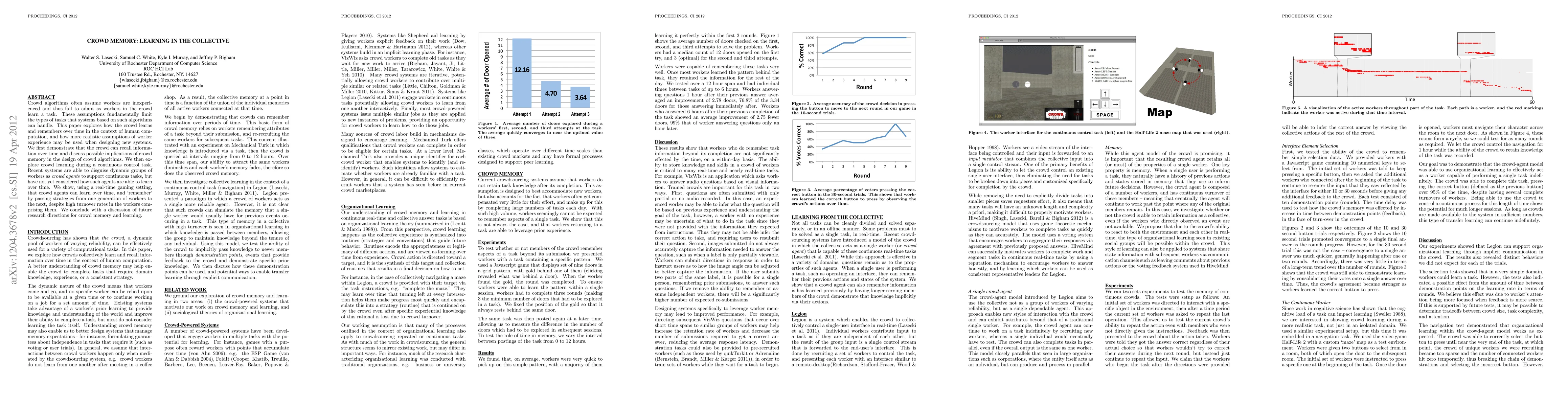 Crowd algorithms often assume workers are inexperienced and thus fail to adapt as workers in the crowd learn a task. These assumptions fundamentally limit the types of tasks that systems based on such algorithms can handle. This paper explores how the crowd learns and remembers over time in the context of human computation, and how more realistic assumptions of worker experience may be used when designing new systems. We first demonstrate that the crowd can recall information over time and discuss possible implications of crowd memory in the design of crowd algorithms. We then explore crowd learning during a continuous control task. Recent systems are able to disguise dynamic groups of workers as crowd agents to support continuous tasks, but have not yet considered how such agents are able to learn over time. We show, using a real-time gaming setting, that crowd agents can learn over time, and `remember' by passing strategies from one generation of workers to the next, despite high turnover rates in the workers comprising them. We conclude with a discussion of future research directions for crowd memory and learning.