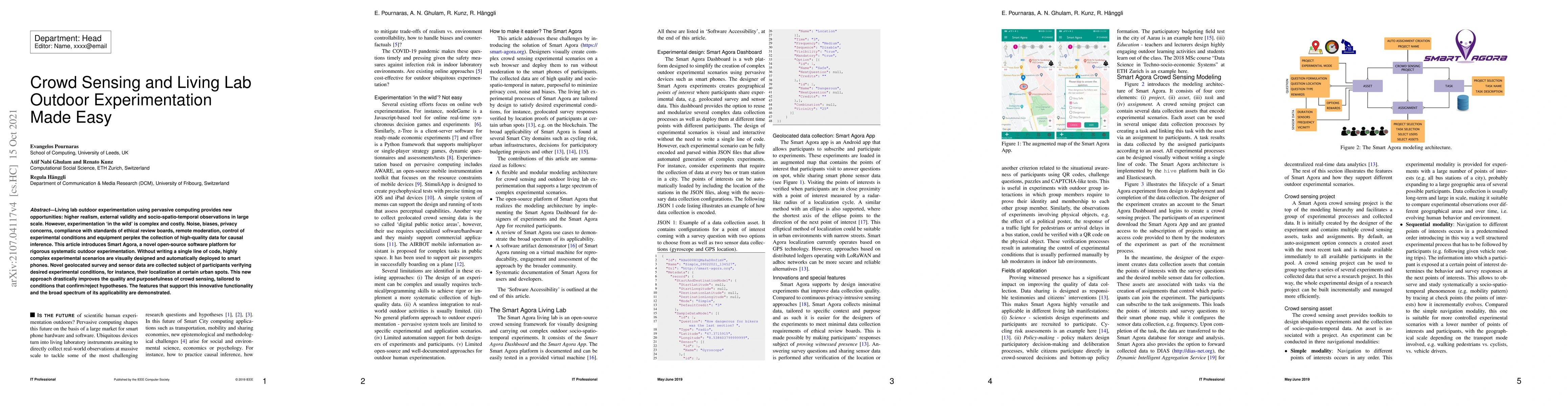 Living lab outdoor experimentation using pervasive computing provides new opportunities: higher realism, external validity and socio-spatio-temporal observations in large scale. However, experimentation `in the wild' is complex and costly. Noise, biases, privacy concerns, compliance with standards of ethical review boards, remote moderation, control of experimental conditions and equipment perplex the collection of high-quality data for causal inference. This article introduces Smart Agora, a novel open-source software platform for rigorous systematic outdoor experimentation. Without writing a single line of code, highly complex experimental scenarios are visually designed and automatically deployed to smart phones. Novel geolocated survey and sensor data are collected subject of participants verifying desired experimental conditions, for instance, their localization at certain urban spots. This new approach drastically improves the quality and purposefulness of crowd sensing, tailored to conditions that confirm/reject hypotheses. The features that support this innovative functionality and the broad spectrum of its applicability are demonstrated.