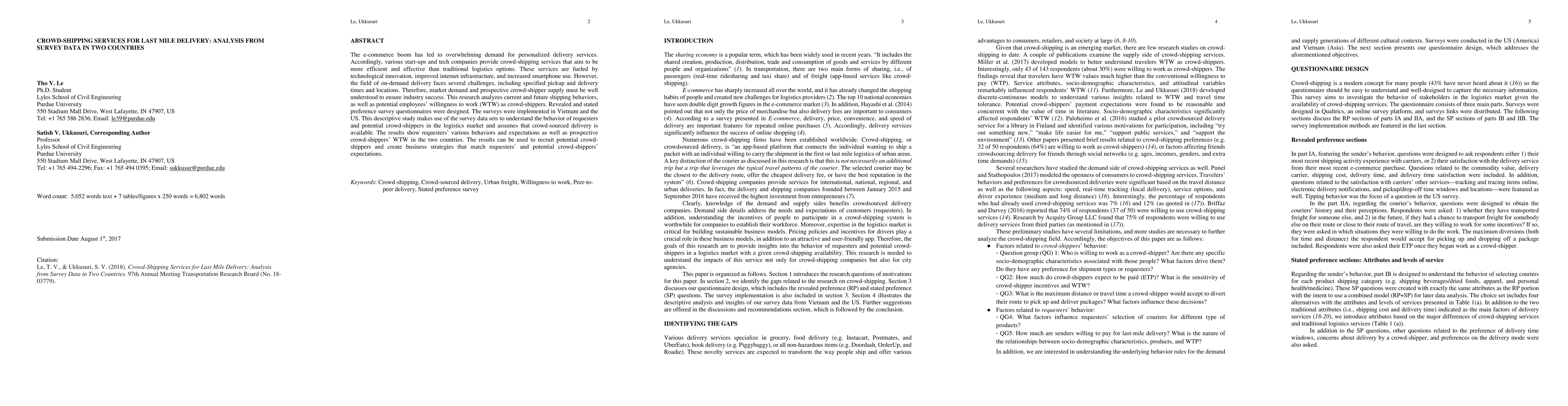 This study analyzed crowd-shipping services in Vietnam and the US to understand requester behaviors and prospective crowd-shippers' willingness to work. It found that requesters expect efficient delivery times and locations, while prospective crowd-shippers are willing to work under specific conditions.