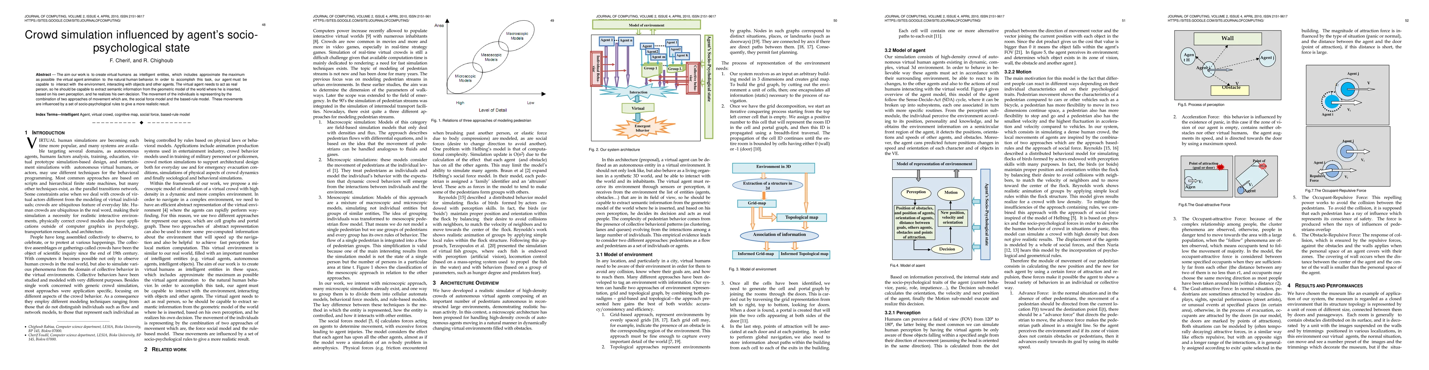 The aim our work is to create virtual humans as intelligent entities, which includes approximate the maximum as possible the virtual agent animation to the natural human behavior. In order to accomplish this task, our agent must be capable to interact with the environment, interacting with objects and other agents. The virtual agent needs to act as real person, so he should be capable to extract semantic information from the geometric model of the world where he is inserted, based on his own perception, and he realizes his own decision. The movement of the individuals is representing by the combination of two approaches of movement which are, the social force model and the based-rule model. These movements are influenced by a set of socio-psychological rules to give a more realistic result.