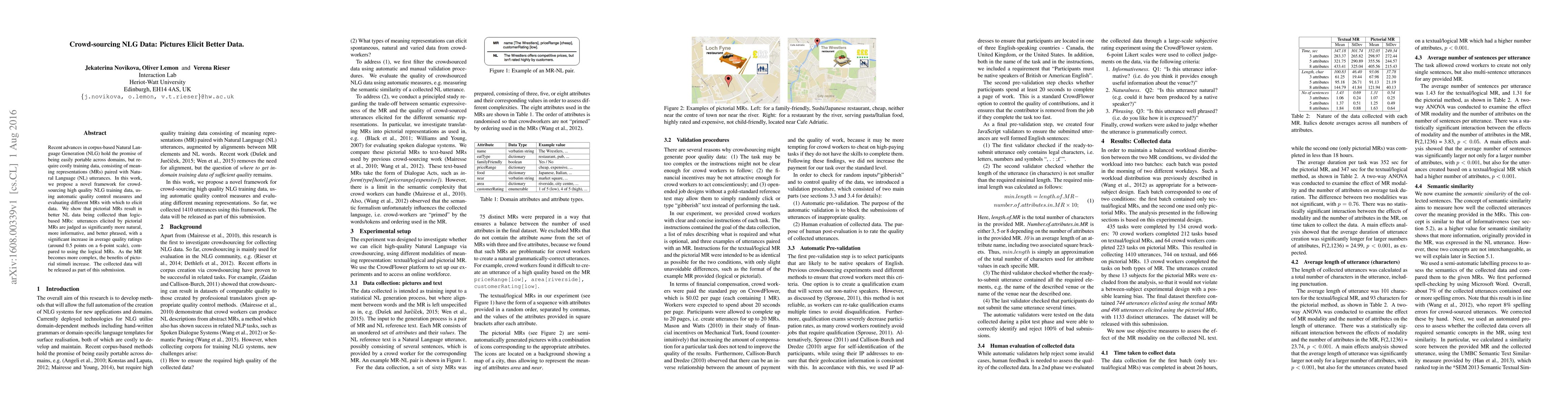 The paper proposes a crowdsourcing framework for collecting high-quality NLG training data using automatic quality control measures. It compares pictorial MRs with logic-based MRs, showing that pictorial MRs elicit better NL data.
