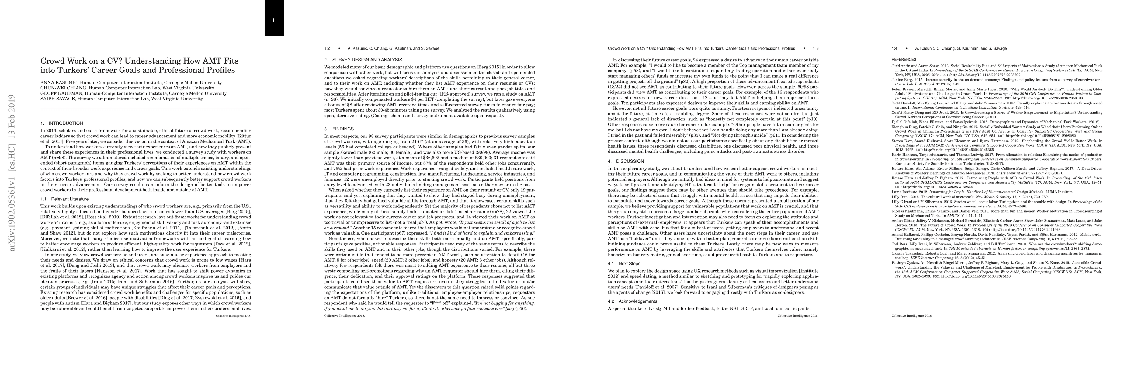 In 2013, scholars laid out a framework for a sustainable, ethical future of crowd work, recommending career ladders so that crowd work can lead to career advancement and more economic mobility. Five years later, we consider this vision in the context of Amazon Mechanical Turk (AMT). To understand how workers currently view their experiences on AMT, and how they publicly present and share these experiences in their professional lives, we conducted a survey study with workers on AMT (n=98). The survey we administered included a combination of multiple choice, binary, and open-ended (short paragraph) items gauging Turkers' perceptions of their experiences on AMT within the context of their broader work experience and career goals. This work extends existing understandings of who crowd workers are and why they crowd work by seeking to better understand how crowd work factors into Turkers' professional profiles, and how we can subsequently better support crowd workers in their career advancement. Our survey results can inform the design of better tools to empower crowd workers in their professional development both inside and outside of AMT.
