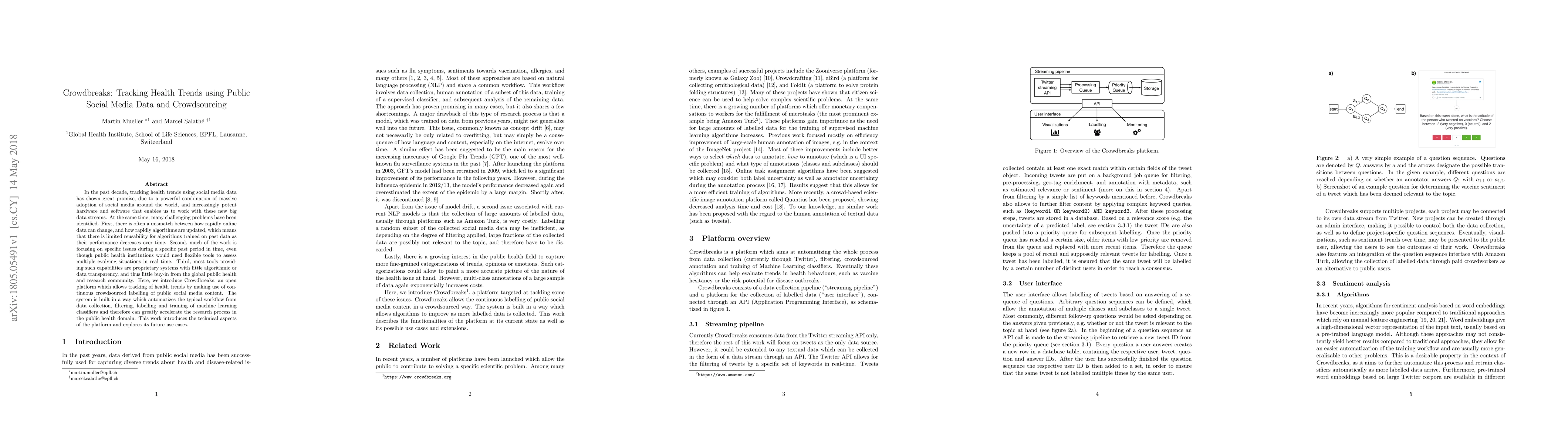 Crowdbreaks is an open platform for tracking health trends using public social media data and crowdsourcing, designed to address the rapid changes in online data and the need for real-time, flexible tools in public health. It automates data collection, filtering, labelling, and machine learning training to accelerate research.