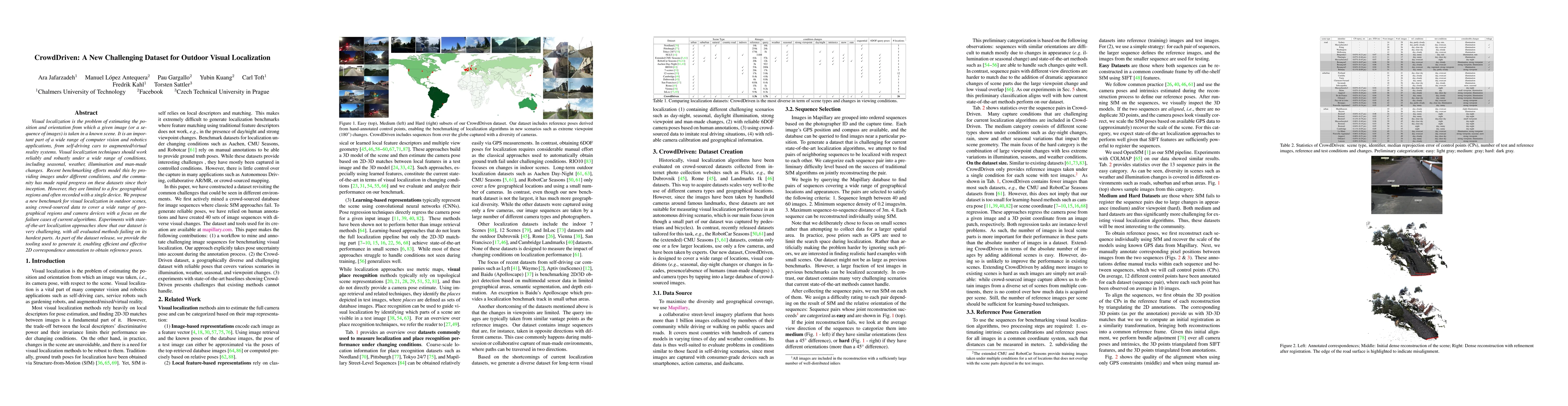 The paper introduces CrowdDriven, a new challenging dataset for outdoor visual localization, leveraging crowd-sourced data to cover diverse geographical regions and camera devices, highlighting the failure cases of current algorithms. The dataset is shown to be highly challenging, with state-of-the-art methods failing on its hardest parts.
