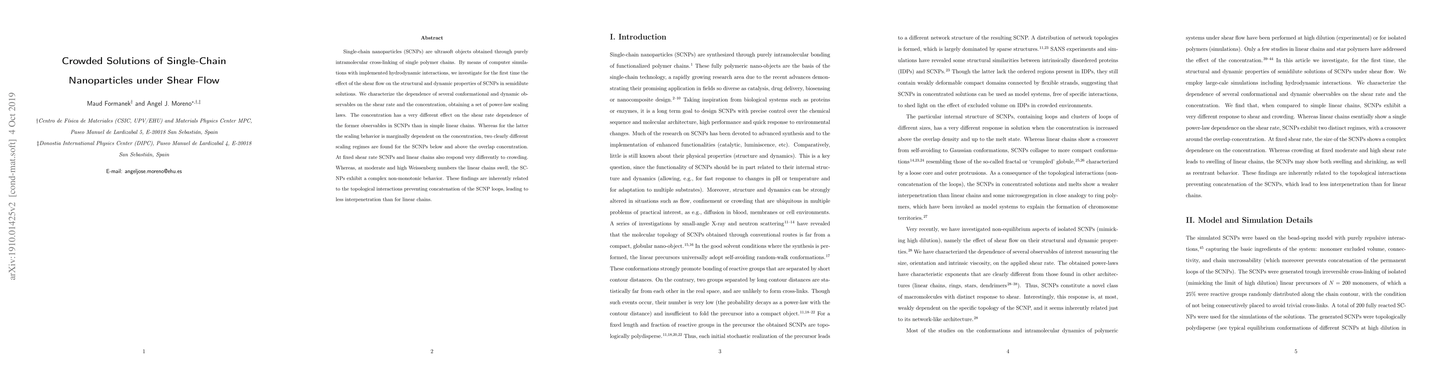 This paper explores the behavior of single-chain nanoparticles (SCNPs) under shear flow through computer simulations, revealing distinct scaling laws for SCNPs compared to linear chains. The study finds that SCNPs exhibit complex, non-monotonic responses to crowding, unlike the swelling behavior of linear chains, due to topological constraints.