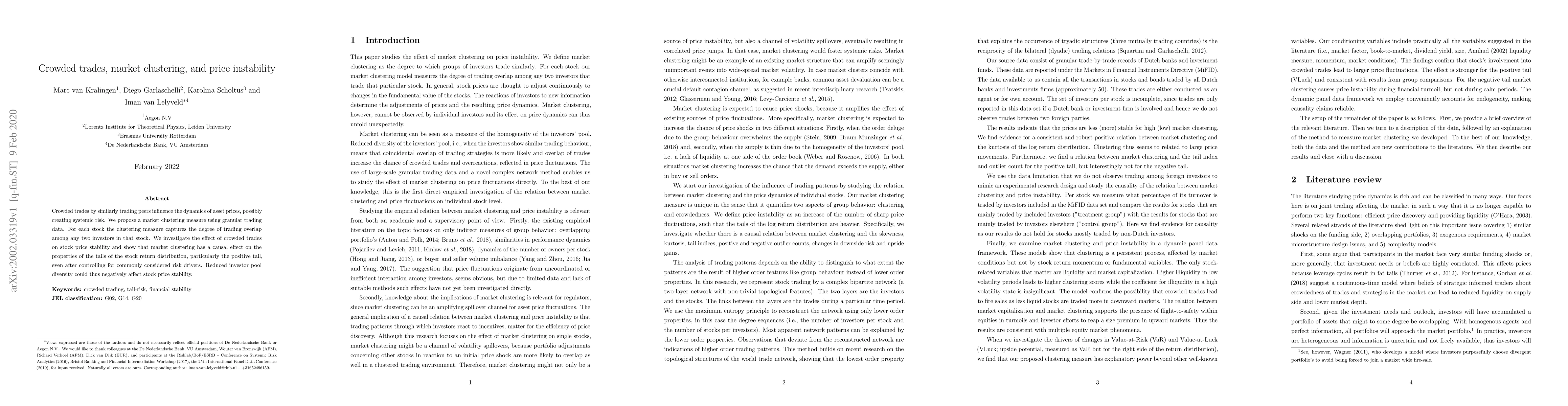 The paper proposes a market clustering measure using granular trading data to capture the degree of trading overlap among investors in each stock. It investigates the effect of crowded trades on stock price stability, showing that market clustering has a causal effect on the properties of the tails of the stock return distribution, particularly the positive tail, even after controlling for risk drivers.