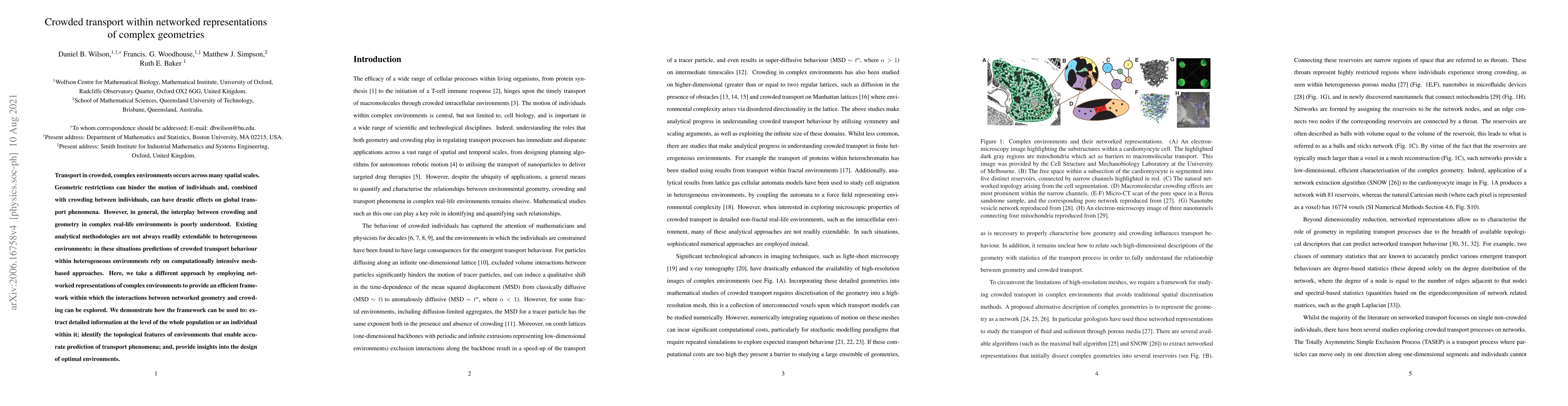 Transport in crowded, complex environments occurs across many spatial scales. Geometric restrictions can hinder the motion of individuals and, combined with crowding between individuals, can have drastic effects on global transport phenomena. However, in general, the interplay between crowding and geometry in complex real-life environments is poorly understood. Existing analytical methodologies are not always readily extendable to heterogeneous environments: in these situations predictions of crowded transport behaviour within heterogeneous environments rely on computationally intensive mesh-based approaches. Here, we take a different approach by employing networked representations of complex environments to provide an efficient framework within which the interactions between networked geometry and crowding can be explored. We demonstrate how the framework can be used to: extract detailed information at the level of the whole population or an individual within it; identify the topological features of environments that enable accurate prediction of transport phenomena; and, provide insights into the design of optimal environments.