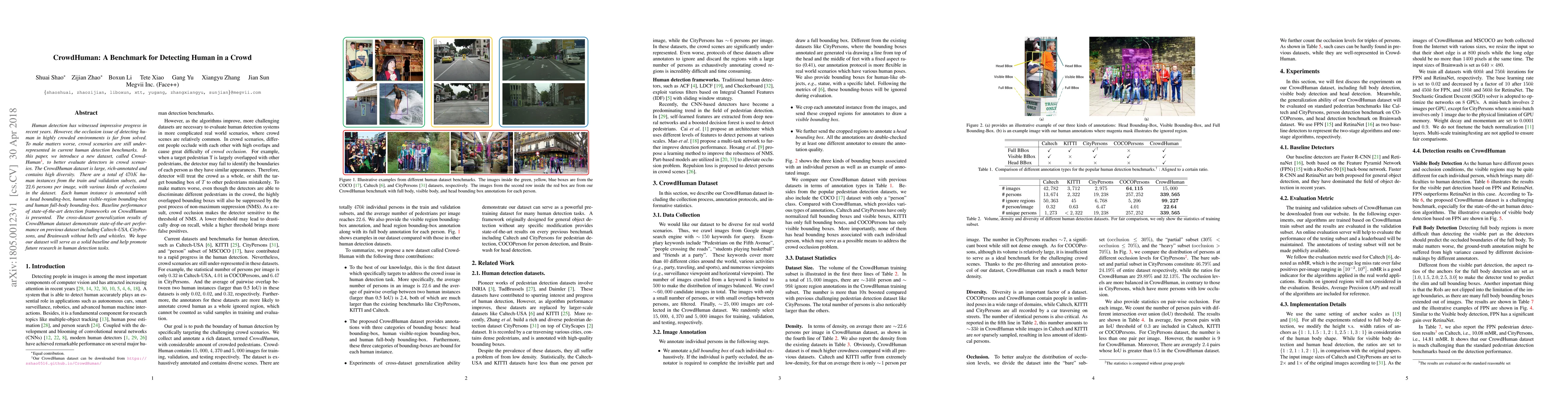 This paper introduces CrowdHuman, a new dataset for evaluating human detection in crowded scenarios, containing 470K human instances with diverse occlusions. It outperforms state-of-the-art models on existing datasets without additional modifications, aiming to foster further research in human detection tasks.