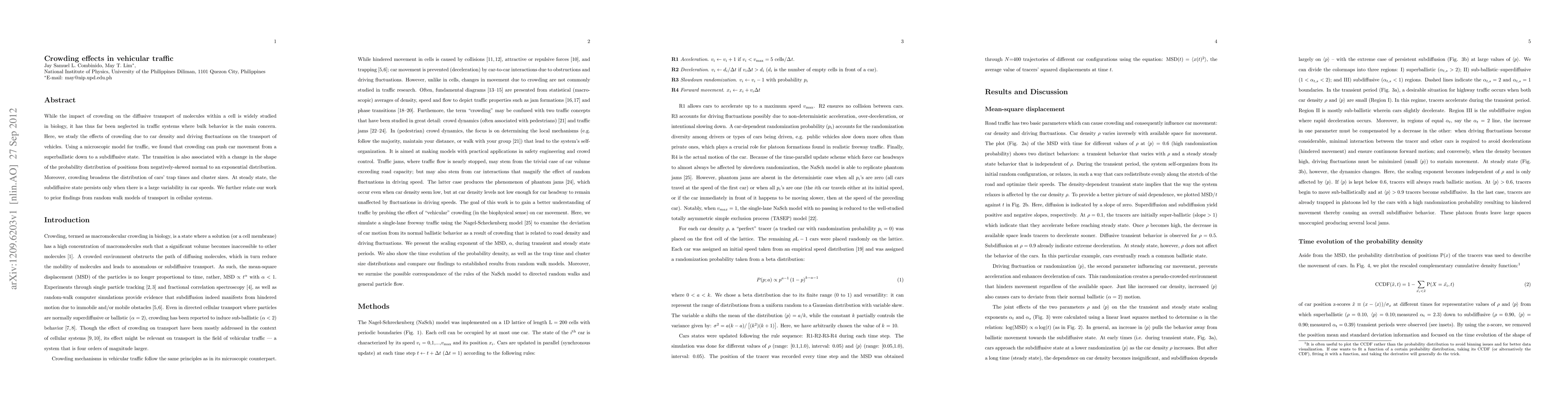 The paper introduces a novel approach to understanding vehicular traffic behavior through the lens of crowding effects, using a microscopic traffic model to demonstrate transitions in car movement states.