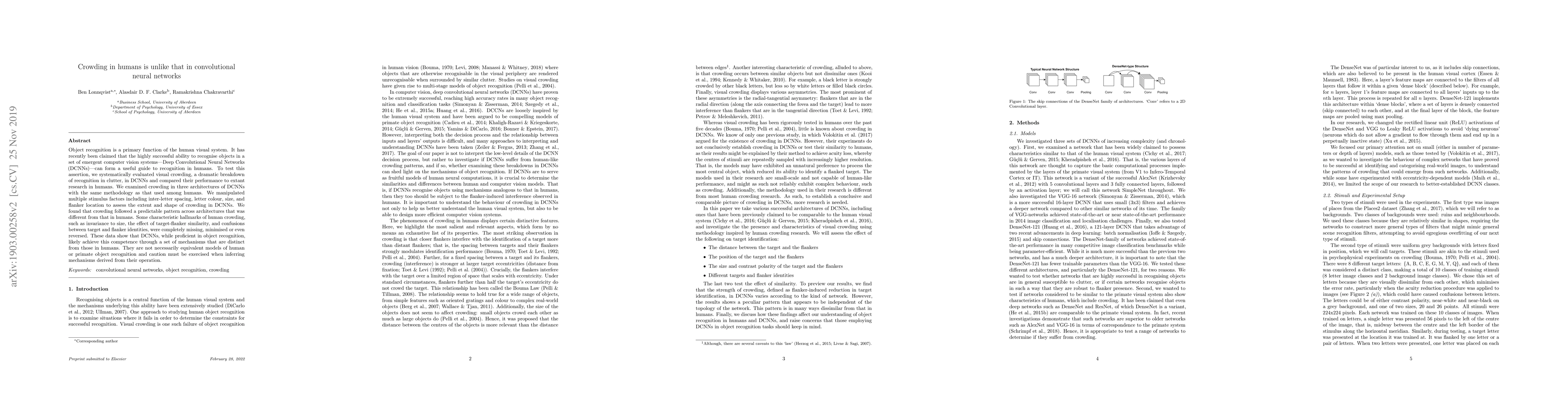 The research compares visual crowding in humans and Deep Convolutional Neural Networks (DCNNs). It finds that while DCNNs are excellent at object recognition, their mechanisms differ significantly from humans, lacking human-like crowding characteristics. This suggests caution when using DCNNs as models for human visual recognition.