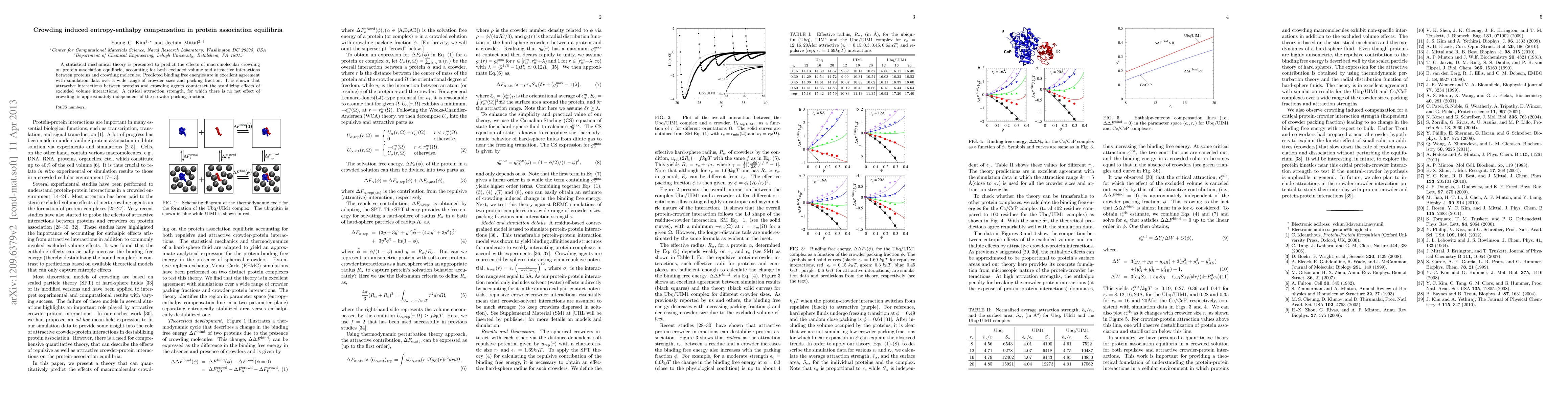 This paper presents a statistical mechanical theory to predict how macromolecular crowding influences protein association equilibria, showing that attractive interactions between proteins and crowding agents can counteract the stabilizing effects of excluded volume, leading to entropy-enthalpy compensation. The model accurately predicts binding free energies and identifies a critical attraction strength unaffected by crowder packing fraction.