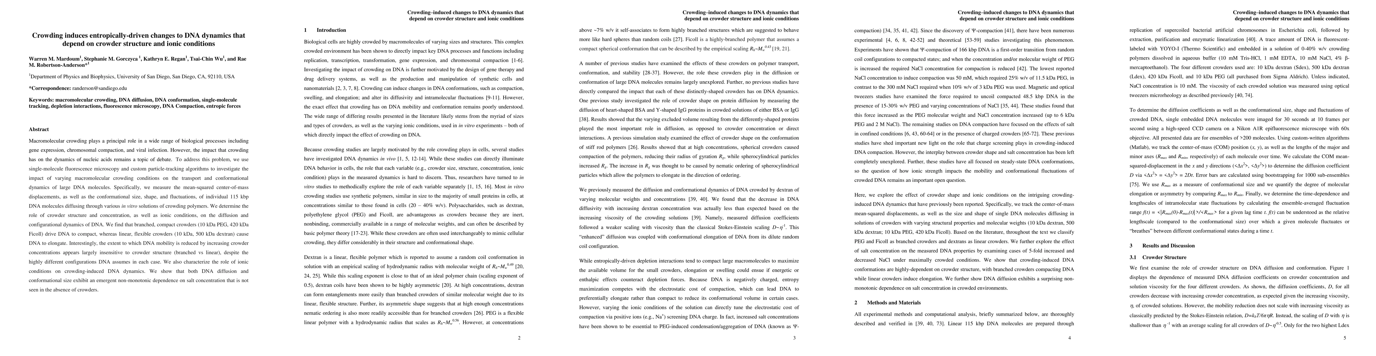 This study uses single-molecule fluorescence microscopy to investigate how different macromolecular crowders affect DNA dynamics. It finds that branched crowders compact DNA, while linear crowders elongate it, with ionic conditions also influencing DNA dynamics in a non-monotonic manner.