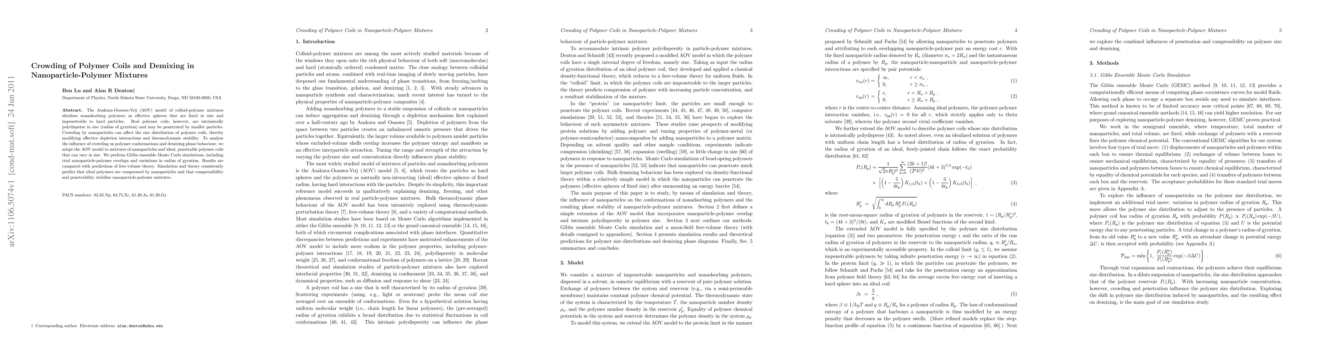 This study adapts the AOV model to examine how nanoparticles affect the size distribution and conformations of penetrable polymer coils, revealing that nanoparticles compress polymers and stabilize mixtures. Simulation results align with free-volume theory predictions, indicating that compressibility and penetrability influence thermodynamic stability in these mixtures.