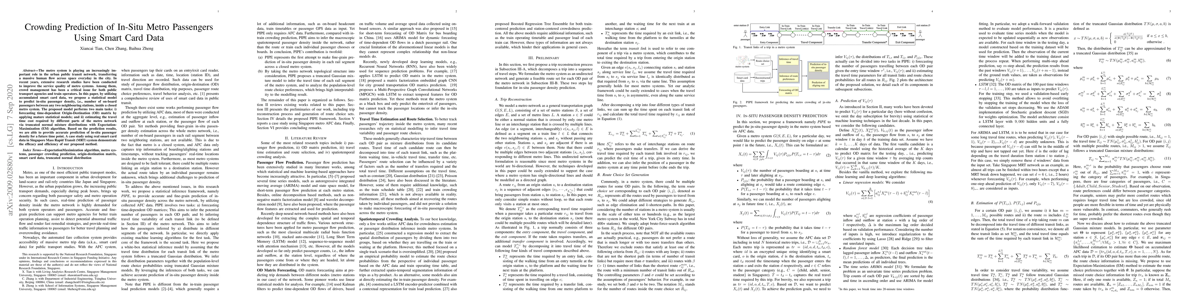 This paper proposes a statistical model using smart card data to predict in-situ metro passenger density between stations. It forecasts time-dependent Origin-Destination matrices and estimates travel time costs, demonstrating effectiveness in the Singapore MRT system.