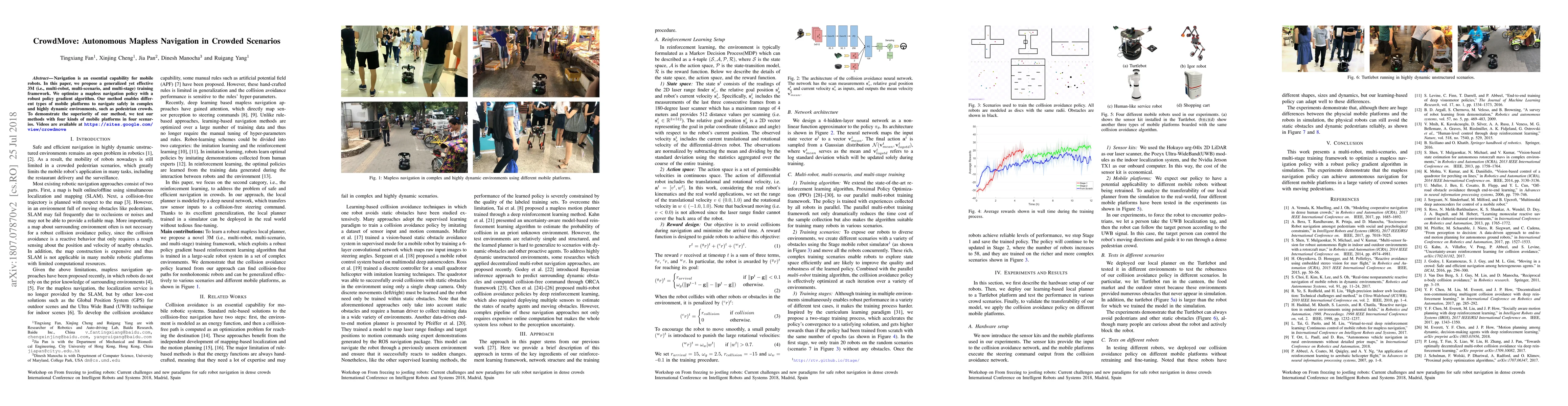 CrowdMove presents a generalized training framework for autonomous mapless navigation in crowded environments, optimizing a robust policy gradient algorithm for multi-robot, multi-scenario, and multi-stage applications. The method is tested on four mobile platforms across four dynamic scenarios, showcasing its effectiveness in complex pedestrian crowds.