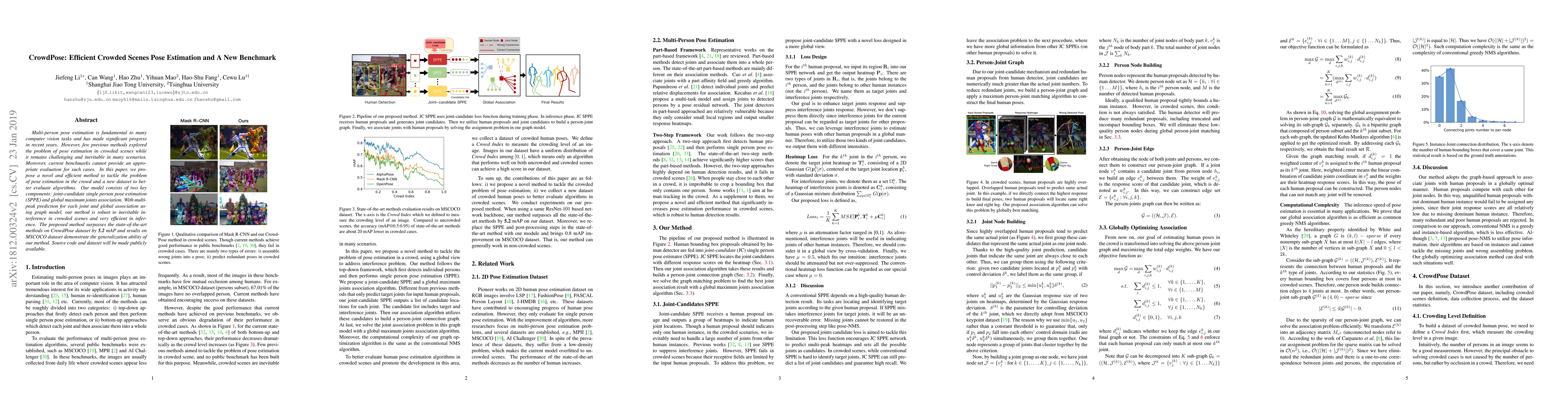 This paper introduces CrowdPose, a novel and efficient method for multi-person pose estimation in crowded scenes, along with a new benchmark dataset. The proposed model combines joint-candidate single person pose estimation and global maximum joints association, achieving superior performance compared to existing methods.