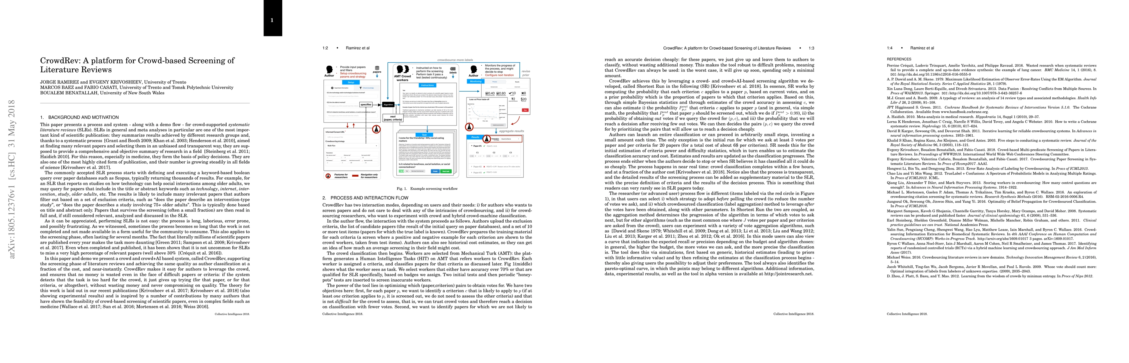 In this paper and demo we present a crowd and crowd+AI based system, called CrowdRev, supporting the screening phase of literature reviews and achieving the same quality as author classification at a fraction of the cost, and near-instantly. CrowdRev makes it easy for authors to leverage the crowd, and ensures that no money is wasted even in the face of difficult papers or criteria: if the system detects that the task is too hard for the crowd, it just gives up trying (for that paper, or for that criteria, or altogether), without wasting money and never compromising on quality.