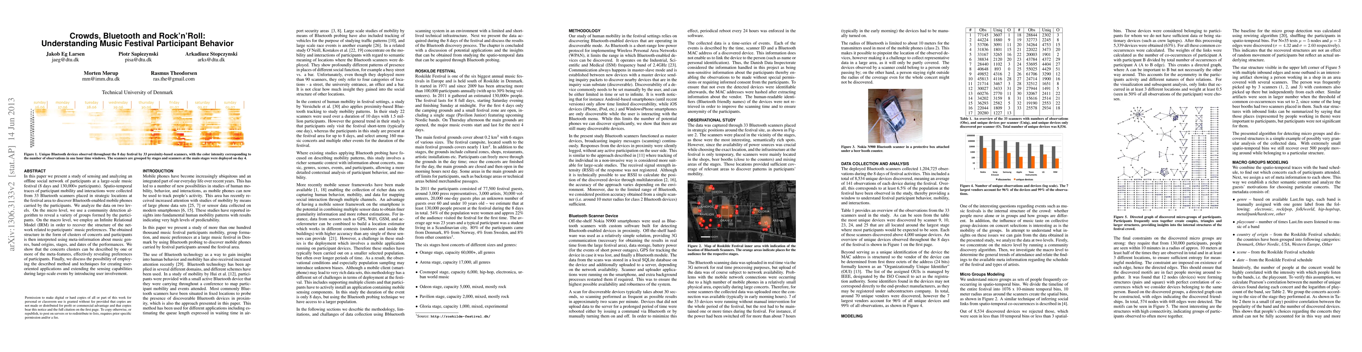 In this paper we present a study of sensing and analyzing an offline social network of participants at a large-scale music festival (8 days, 130,000+ participants). We place 33 fixed-location Bluetooth scanners in strategic spots around the festival area to discover Bluetooth-enabled mobile phones carried by the participants, and thus collect spatio-temporal traces of their mobility and interactions. We subsequently analyze the data on two levels. On the micro level, we run a community detection algorithm to reveal a variety of groups the festival participants form. On the macro level, we employ an Infinite Relational Model (IRM) in order to recover the structure of the social network related to participants' music preferences. The obtained structure in the form of clusters of concerts and participants is then interpreted using meta-information about music genres, band origins, stages, and dates of performances. We show that most of the concerts clusters can be described by one or more of the meta-features, effectively revealing preferences of participants (e.g. a cluster of US bands) and discuss the significance of the findings and the potential and limitations of the used method. Finally, we discuss the possibility of employing the described method and techniques for creating user-oriented applications and extending the sensing capabilities during large-scale events by introducing user involvement.