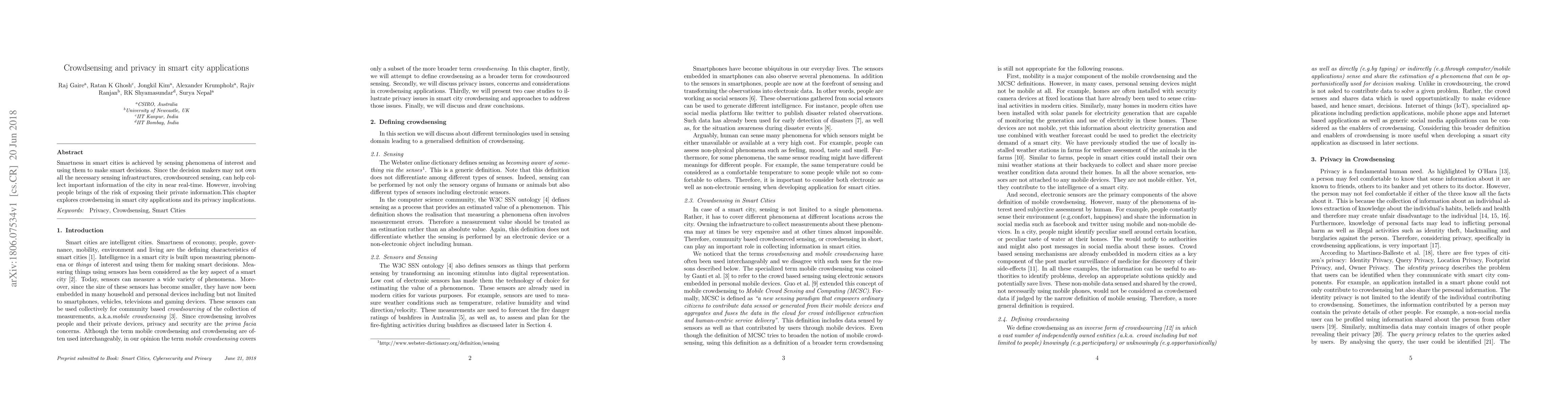 This paper examines the use of crowdsourced sensing in smart city applications to gather real-time data, while also addressing the significant privacy risks associated with exposing individuals' private information. It explores strategies to mitigate these risks.