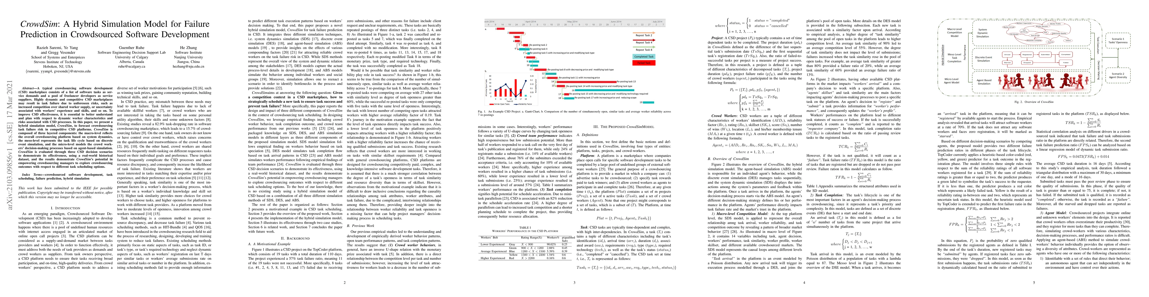 A typical crowdsourcing software development(CSD) marketplace consists of a list of software tasks as service demands and a pool of freelancer developers as service suppliers. Highly dynamic and competitive CSD market places may result in task failure due to unforeseen risks, such as increased competition over shared worker supply, or uncertainty associated with workers' experience and skills, and so on. To improve CSD effectiveness, it is essential to better understand and plan with respect to dynamic worker characteristics and risks associated with CSD processes. In this paper, we present a hybrid simulation model, CrowdSim, to forecast crowdsourcing task failure risk in competitive CSD platforms. CrowdSim is composed of three layered components: the macro-level reflects the overall crowdsourcing platform based on system dynamics,the meso-level represents the task life cycle based on discrete event simulation, and the micro-level models the crowd workers' decision-making processes based on agent-based simulation. CrowdSim is evaluated through three CSD decision scenarios to demonstrate its effectiveness, using a real-world historical dataset and the results demonstrate CrowdSim's potential in empowering crowdsourcing managers to explore crowdsourcing outcomes with respect to different task scheduling options.