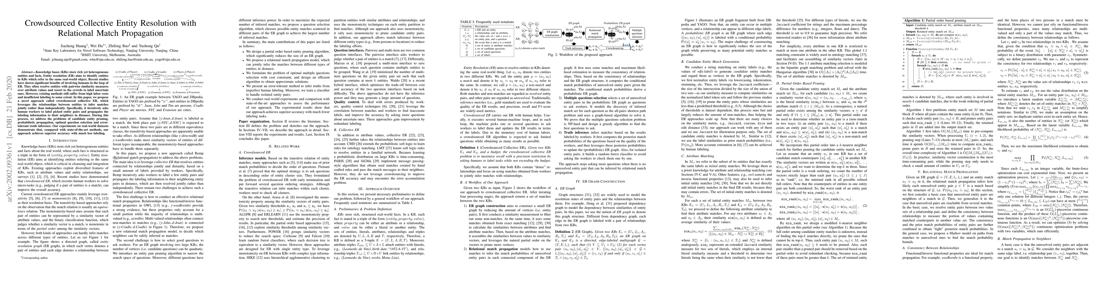 This paper proposes a novel crowdsourced collective entity resolution method that leverages relational match propagation to jointly infer entity matches, reducing labeling effort and improving accuracy. The approach iteratively asks human workers to label entity pairs and propagates this information to related entities, addressing issues like candidate pruning and error-tolerant truth inference.