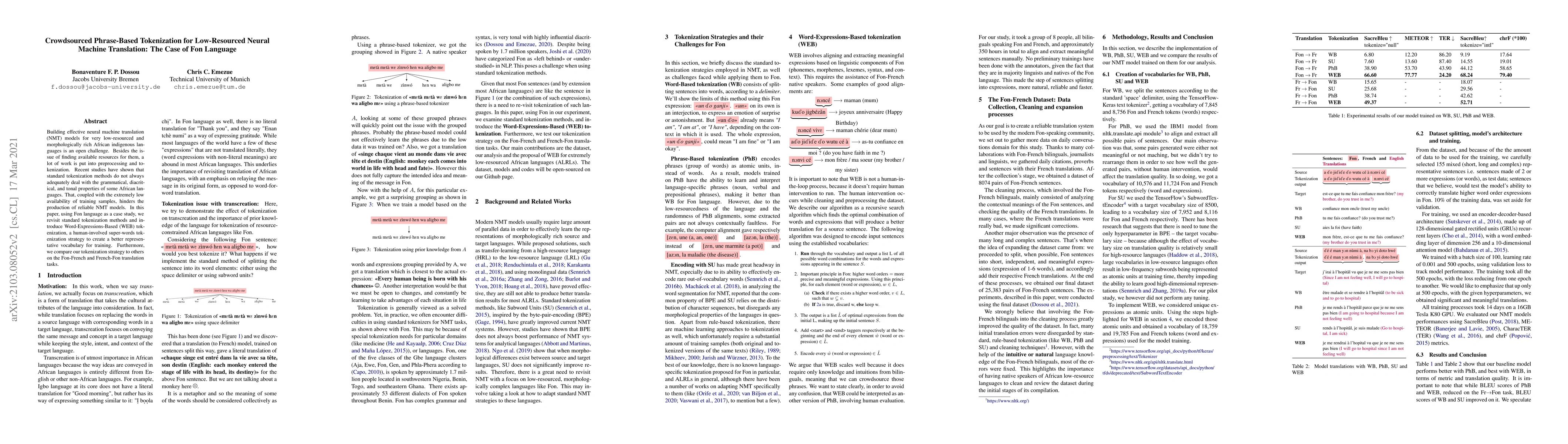 Building effective neural machine translation (NMT) models for very low-resourced and morphologically rich African indigenous languages is an open challenge. Besides the issue of finding available resources for them, a lot of work is put into preprocessing and tokenization. Recent studies have shown that standard tokenization methods do not always adequately deal with the grammatical, diacritical, and tonal properties of some African languages. That, coupled with the extremely low availability of training samples, hinders the production of reliable NMT models. In this paper, using Fon language as a case study, we revisit standard tokenization methods and introduce Word-Expressions-Based (WEB) tokenization, a human-involved super-words tokenization strategy to create a better representative vocabulary for training. Furthermore, we compare our tokenization strategy to others on the Fon-French and French-Fon translation tasks.