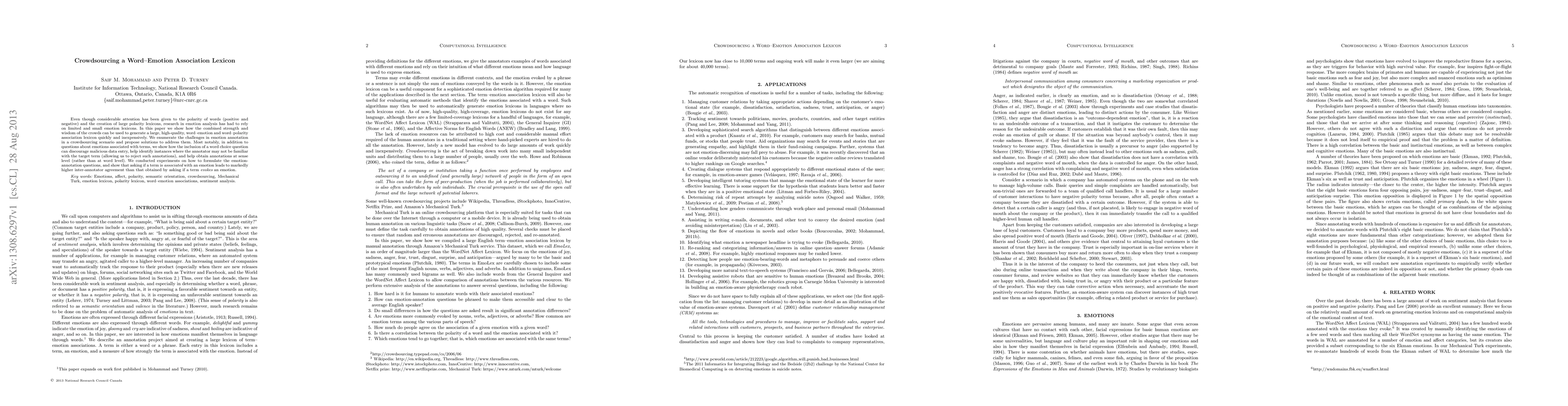 This paper details the creation of a large word-emotion association lexicon through crowdsourcing, leveraging collective wisdom to generate high-quality data. It addresses challenges in emotion annotation, proposing solutions like word choice questions to filter out malicious entries and improve data accuracy.