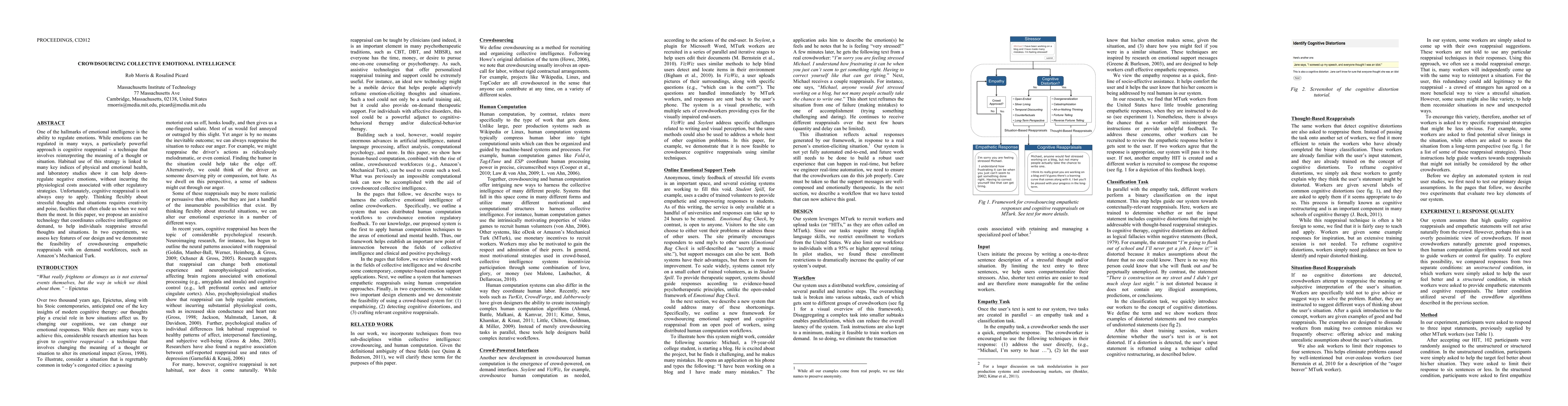 One of the hallmarks of emotional intelligence is the ability to regulate emotions. Research suggests that cognitive reappraisal - a technique that involves reinterpreting the meaning of a thought or situation - can down-regulate negative emotions, without incurring significant psychological or physiological costs. Habitual use of this strategy is also linked to many key indices of physical and emotional health. Unfortunately, this technique is not always easy to apply. Thinking flexibly about stressful thoughts and situations requires creativity and poise, faculties that often elude us when we need them the most. In this paper, we propose an assistive technology that coordinates collective intelligence on demand, to help individuals reappraise stressful thoughts and situations. In two experiments, we assess key features of our design and we demonstrate the feasibility of crowdsourcing empathetic reappraisals with on demand workforces, such as Amazon's Mechanical Turk.