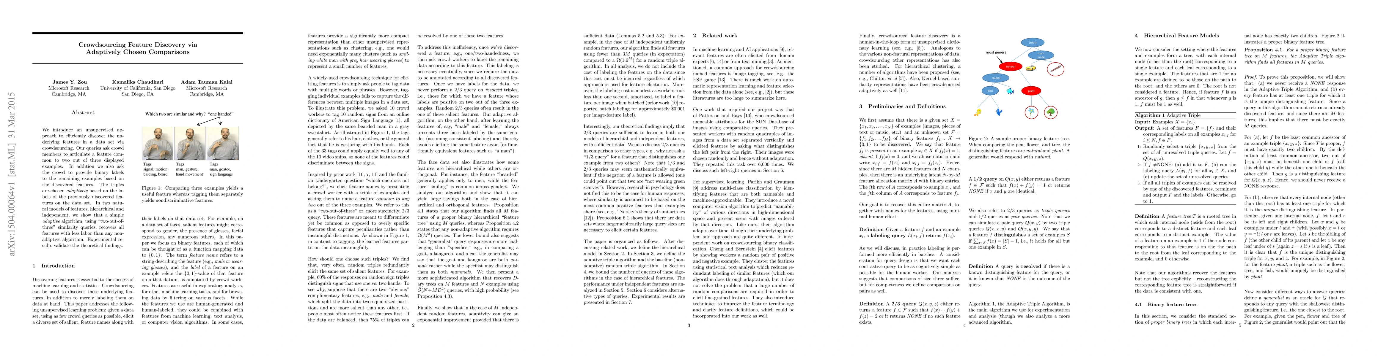 We introduce an unsupervised approach to efficiently discover the underlying features in a data set via crowdsourcing. Our queries ask crowd members to articulate a feature common to two out of three displayed examples. In addition we also ask the crowd to provide binary labels to the remaining examples based on the discovered features. The triples are chosen adaptively based on the labels of the previously discovered features on the data set. In two natural models of features, hierarchical and independent, we show that a simple adaptive algorithm, using "two-out-of-three" similarity queries, recovers all features with less labor than any nonadaptive algorithm. Experimental results validate the theoretical findings.