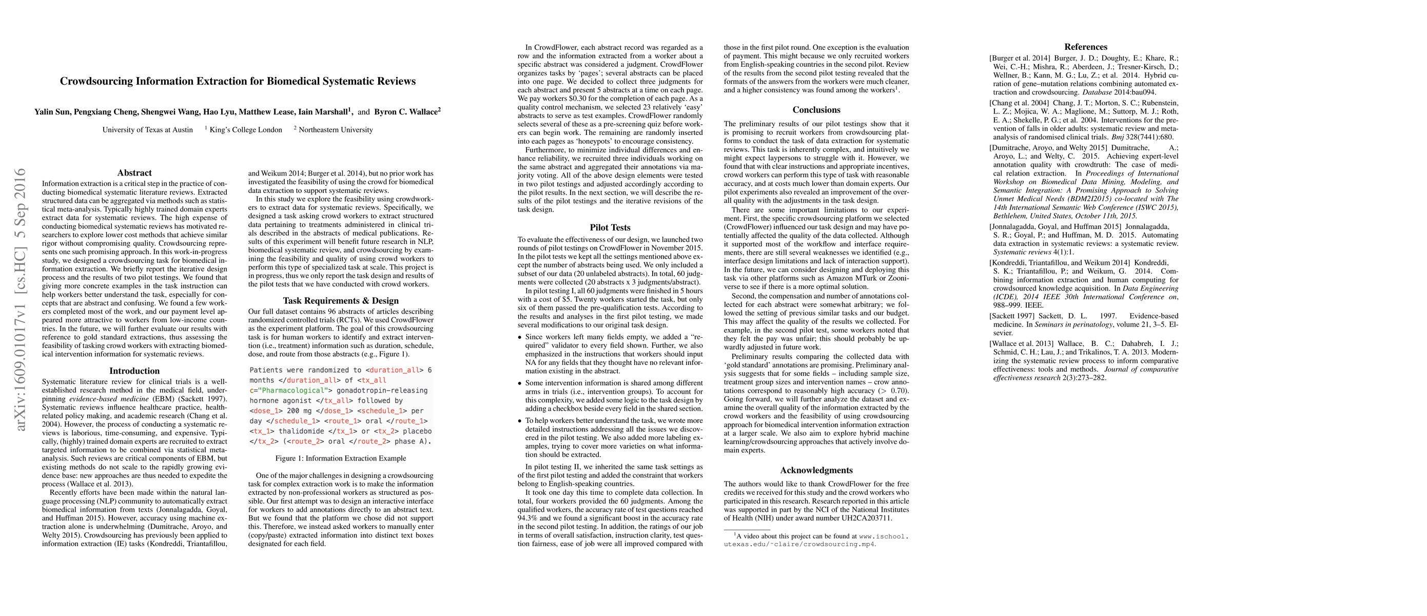 This study explores crowdsourcing as a cost-effective method for biomedical information extraction in systematic reviews. Initial pilot tests indicate that clearer task instructions improve worker performance, especially for complex concepts, and that workers from low-income countries are more attracted to the payment offered. Future work will assess the accuracy of crowdsourced data against gold standard extractions.