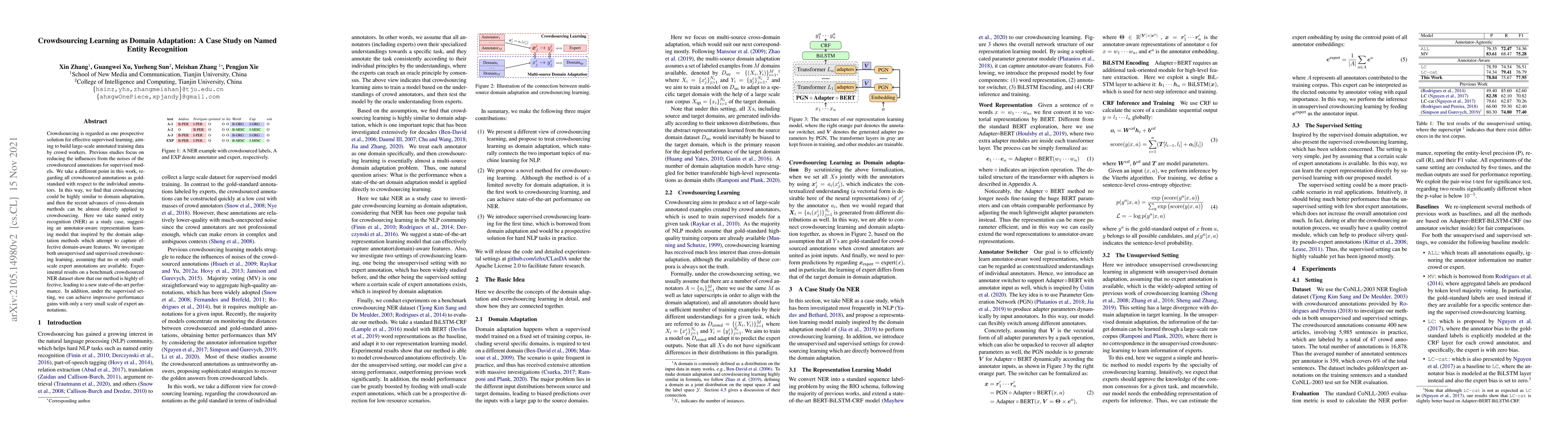Crowdsourcing is regarded as one prospective solution for effective supervised learning, aiming to build large-scale annotated training data by crowd workers. Previous studies focus on reducing the influences from the noises of the crowdsourced annotations for supervised models. We take a different point in this work, regarding all crowdsourced annotations as gold-standard with respect to the individual annotators. In this way, we find that crowdsourcing could be highly similar to domain adaptation, and then the recent advances of cross-domain methods can be almost directly applied to crowdsourcing. Here we take named entity recognition (NER) as a study case, suggesting an annotator-aware representation learning model that inspired by the domain adaptation methods which attempt to capture effective domain-aware features. We investigate both unsupervised and supervised crowdsourcing learning, assuming that no or only small-scale expert annotations are available. Experimental results on a benchmark crowdsourced NER dataset show that our method is highly effective, leading to a new state-of-the-art performance. In addition, under the supervised setting, we can achieve impressive performance gains with only a very small scale of expert annotations.