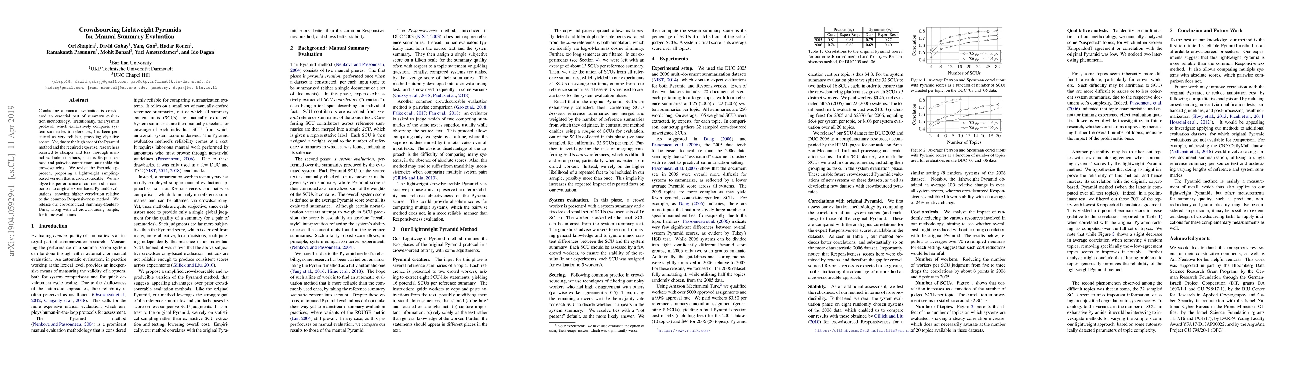 Conducting a manual evaluation is considered an essential part of summary evaluation methodology. Traditionally, the Pyramid protocol, which exhaustively compares system summaries to references, has been perceived as very reliable, providing objective scores. Yet, due to the high cost of the Pyramid method and the required expertise, researchers resorted to cheaper and less thorough manual evaluation methods, such as Responsiveness and pairwise comparison, attainable via crowdsourcing. We revisit the Pyramid approach, proposing a lightweight sampling-based version that is crowdsourcable. We analyze the performance of our method in comparison to original expert-based Pyramid evaluations, showing higher correlation relative to the common Responsiveness method. We release our crowdsourced Summary-Content-Units, along with all crowdsourcing scripts, for future evaluations.