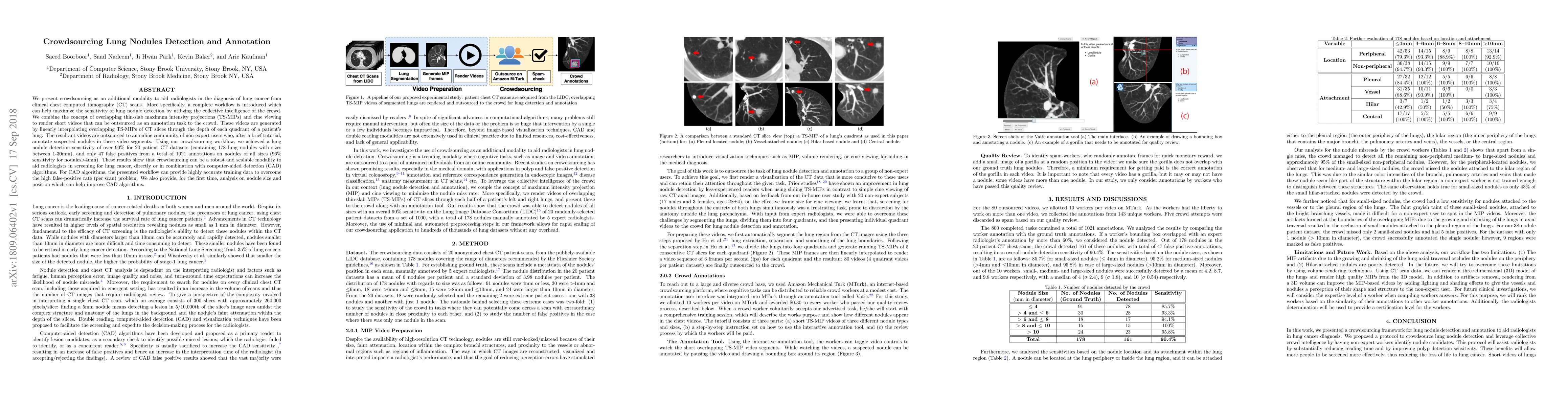This paper explores crowdsourcing as an aid to radiologists for lung cancer detection in chest CT scans, achieving over 90% sensitivity using non-expert users. The method involves generating short video clips from CT scans for crowd annotation, demonstrating robustness and scalability for lung nodule detection.