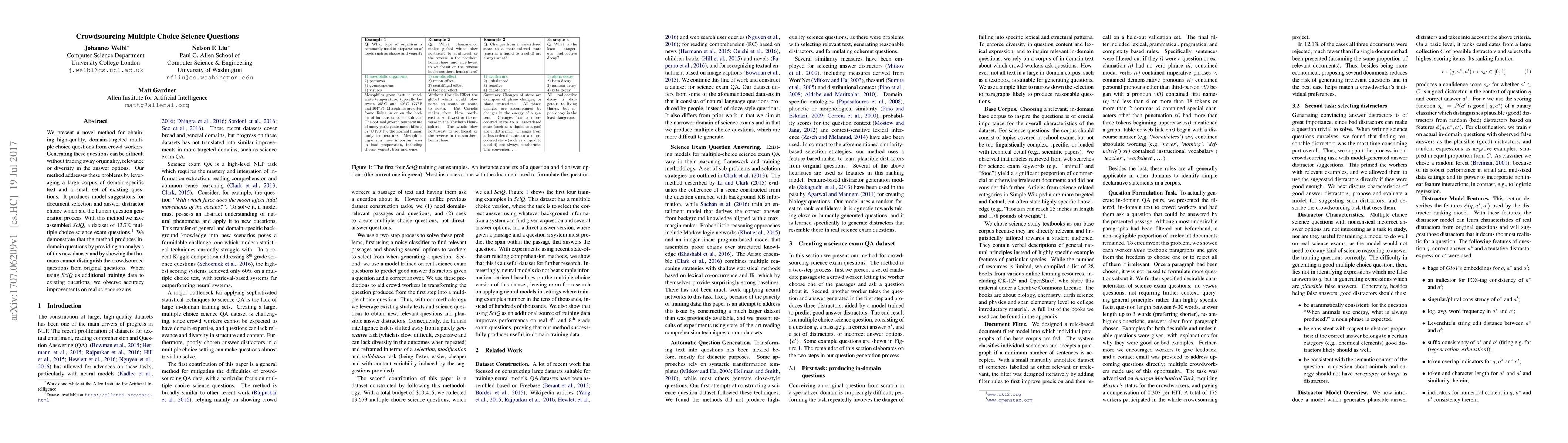 This paper introduces a method for generating high-quality, domain-specific multiple choice science questions via crowdsourcing, leveraging existing texts and questions to aid in the process. The resulting SciQ dataset, composed of 13.7K questions, shows no distinguishable difference from original questions and enhances accuracy on science exams when used as additional training data.