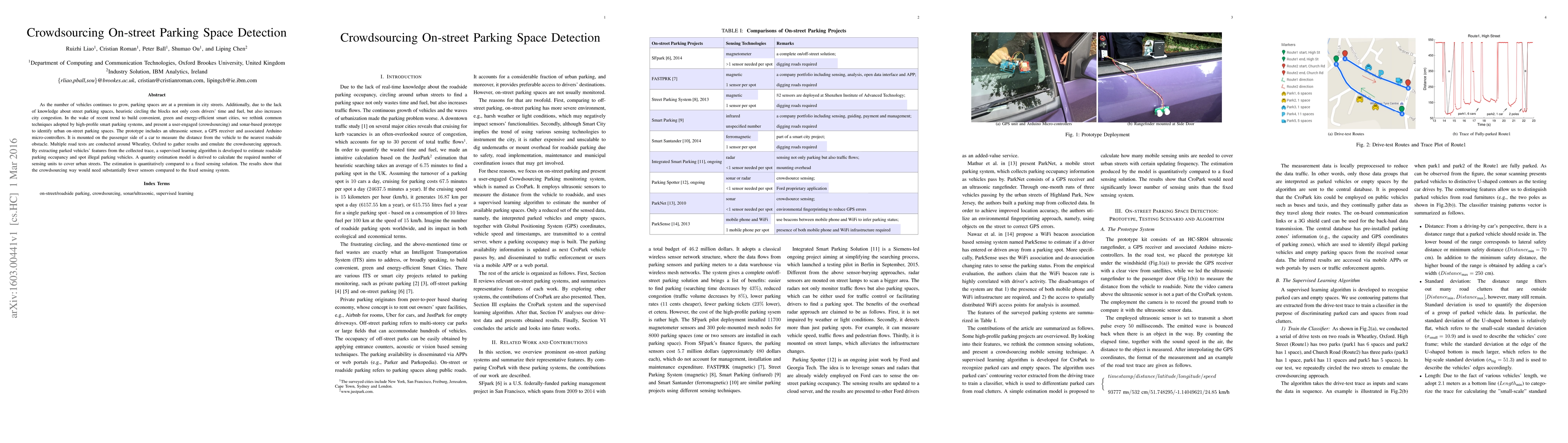 This paper proposes a crowdsourcing approach using ultrasonic sensors and GPS to detect on-street parking spaces, reducing the need for time-consuming circling and city congestion. The prototype, tested in Wheatley, Oxford, uses an Arduino-based system to gather data, which is then analyzed to estimate parking occupancy and spot illegal parking. The study finds that crowdsourcing requires fewer sensors than fixed systems.