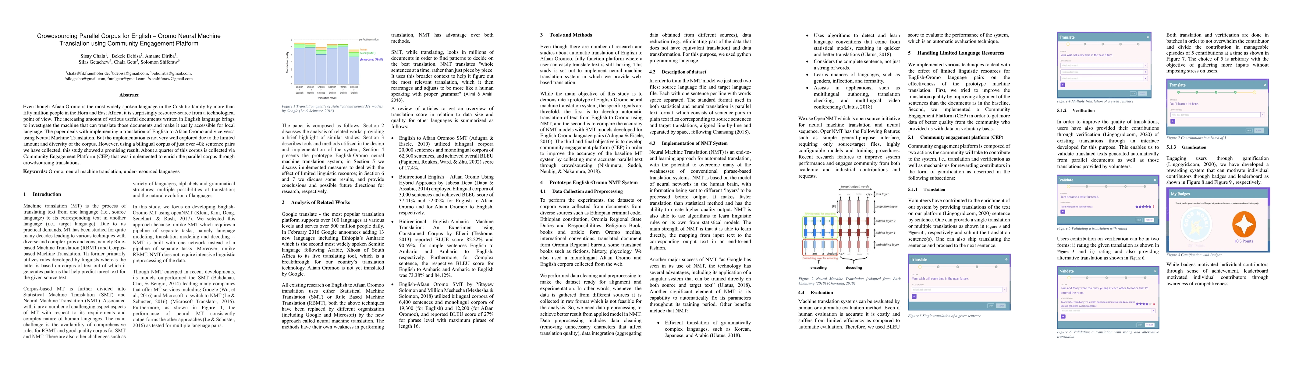 This paper explores the implementation of Neural Machine Translation for English-Oromo language pairs, addressing the scarcity of resources for Afaan Oromo. It utilizes a bilingual corpus of over 40k sentence pairs, with a quarter sourced via a Community Engagement Platform to crowdsource translations, achieving promising results.