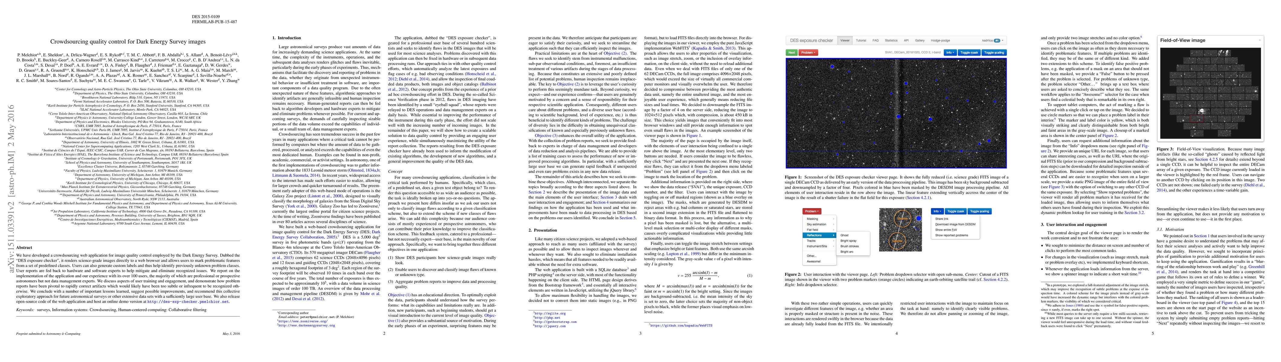 A crowdsourcing web application was developed to improve image quality control for the Dark Energy Survey, allowing users to mark problematic features and contributing to rapid correction of artifacts.