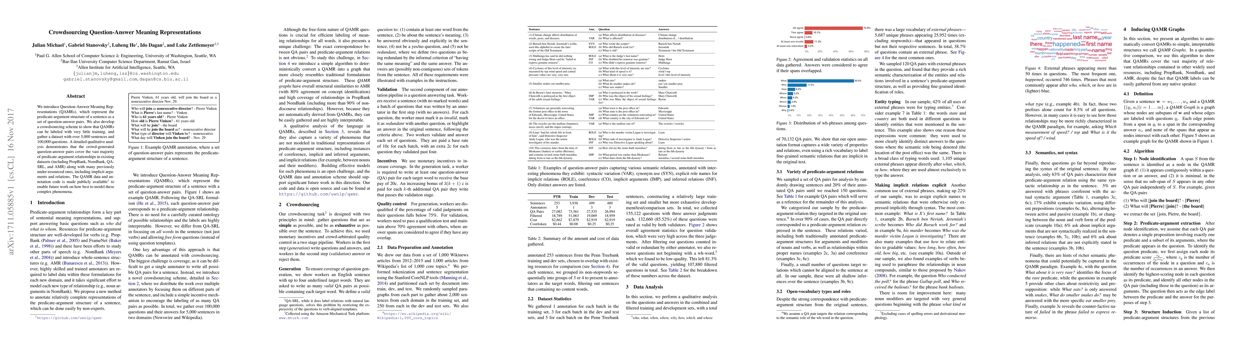We introduce Question-Answer Meaning Representations (QAMRs), which represent the predicate-argument structure of a sentence as a set of question-answer pairs. We also develop a crowdsourcing scheme to show that QAMRs can be labeled with very little training, and gather a dataset with over 5,000 sentences and 100,000 questions. A detailed qualitative analysis demonstrates that the crowd-generated question-answer pairs cover the vast majority of predicate-argument relationships in existing datasets (including PropBank, NomBank, QA-SRL, and AMR) along with many previously under-resourced ones, including implicit arguments and relations. The QAMR data and annotation code is made publicly available to enable future work on how best to model these complex phenomena.