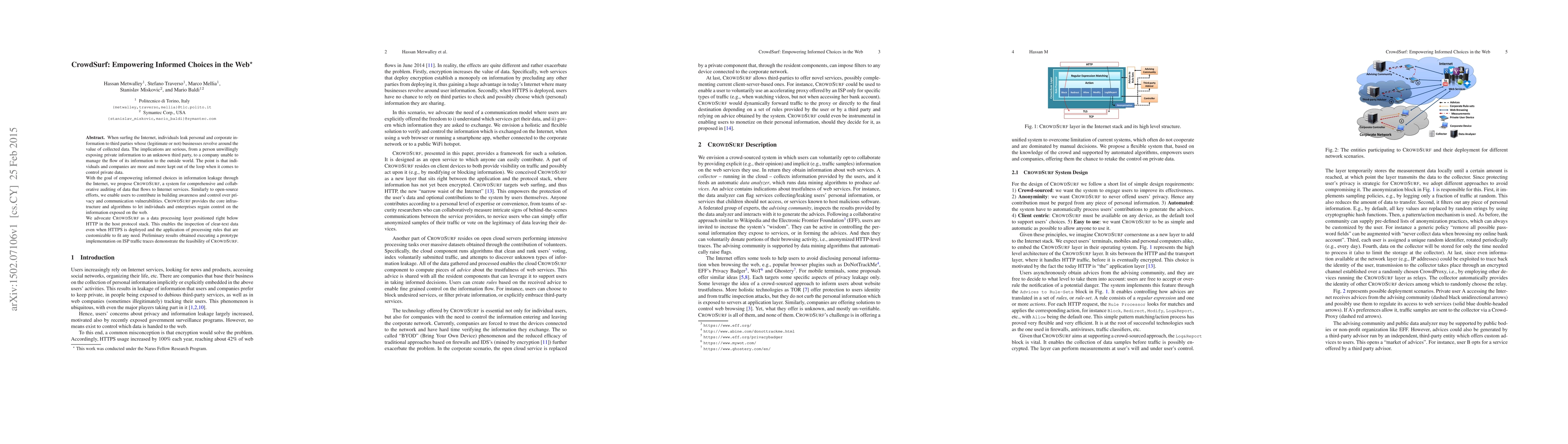 When surfing the Internet, individuals leak personal and corporate information to third parties whose (legitimate or not) businesses revolve around the value of collected data. The implications are serious, from a person unwillingly exposing private information to an unknown third party, to a company unable to manage the flow of its information to the outside world. The point is that individuals and companies are more and more kept out of the loop when it comes to control private data. With the goal of empowering informed choices in information leakage through the Internet, we propose CROWDSURF, a system for comprehensive and collaborative auditing of data that flows to Internet services. Similarly to open-source efforts, we enable users to contribute in building awareness and control over privacy and communication vulnerabilities. CROWDSURF provides the core infrastructure and algorithms to let individuals and enterprises regain control on the information exposed on the web. We advocate CROWDSURF as a data processing layer positioned right below HTTP in the host protocol stack. This enables the inspection of clear-text data even when HTTPS is deployed and the application of processing rules that are customizable to fit any need. Preliminary results obtained executing a prototype implementation on ISP traffic traces demonstrate the feasibility of CROWDSURF.